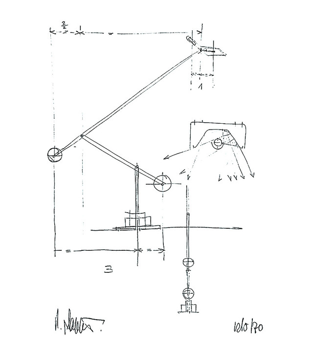 The counterweight system in the first study model was made with jam jars that Richard Sapper filled and emptied with water, so he managed to define the right weight to maintain the perfect balance.
