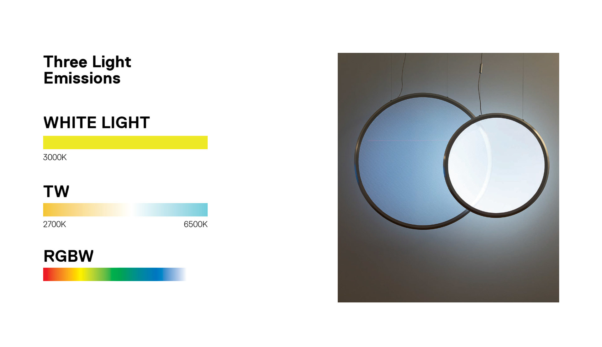An ultra-lightweight circular aluminium profile houses an LED strip that injects light into a transparent PMMA surface with a pattern of distributed micro-incisions for maximum efficiency and uniformity.