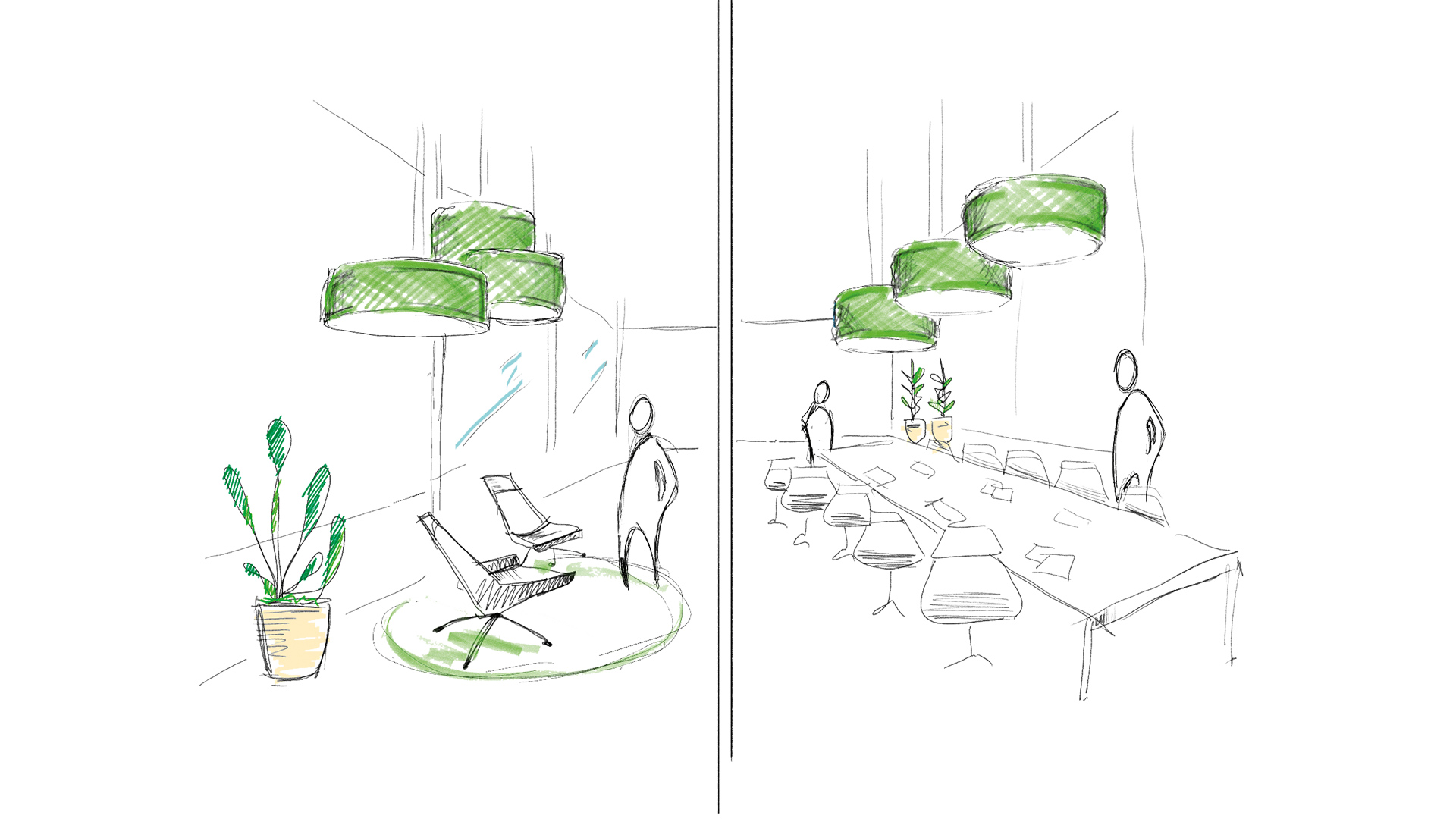 Eggboard Circle creates a perfect environmental ambience by combining acoustic control and comfortable lighting, with a transversal solution that fits perfectly into living and working spaces.