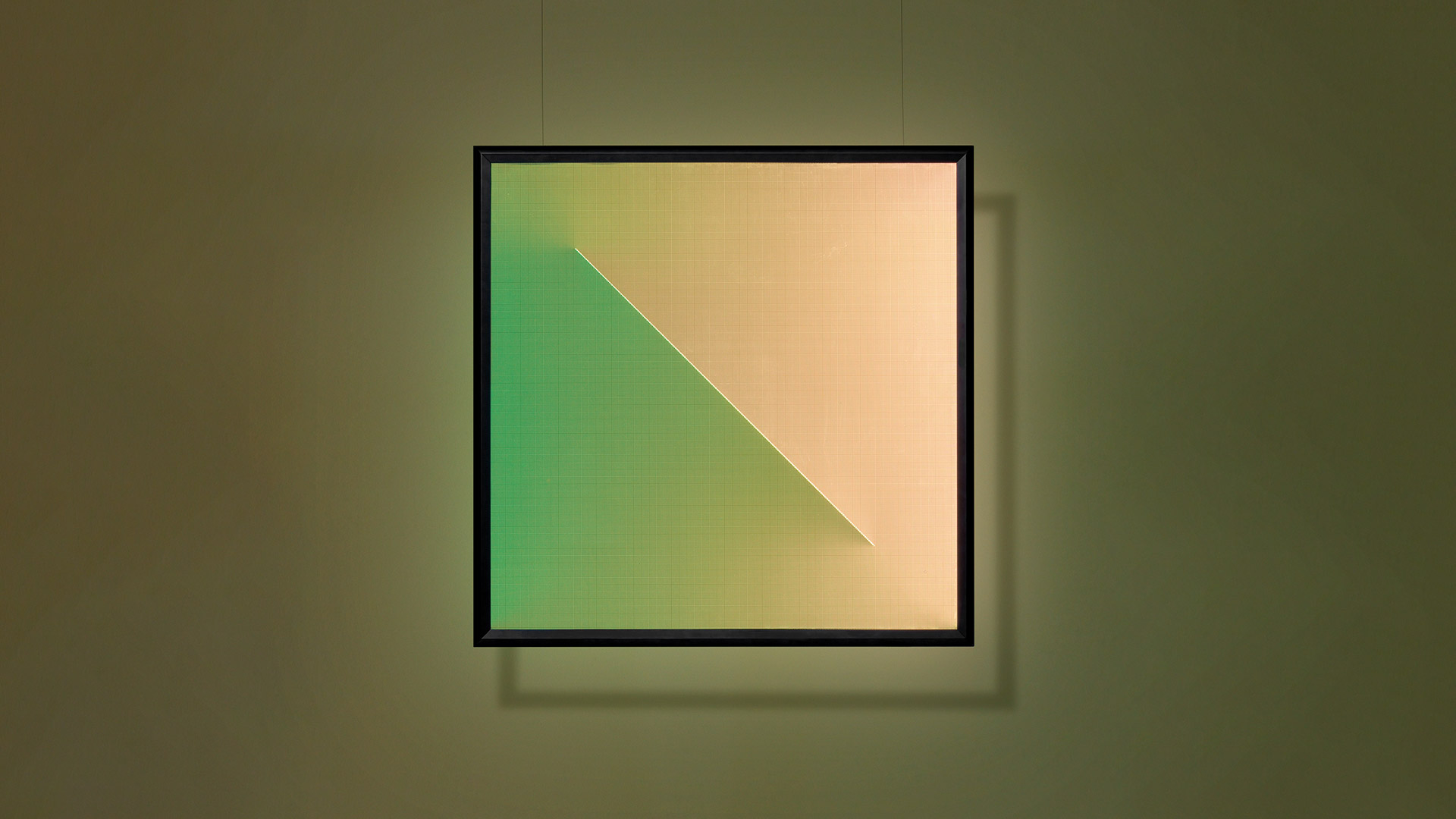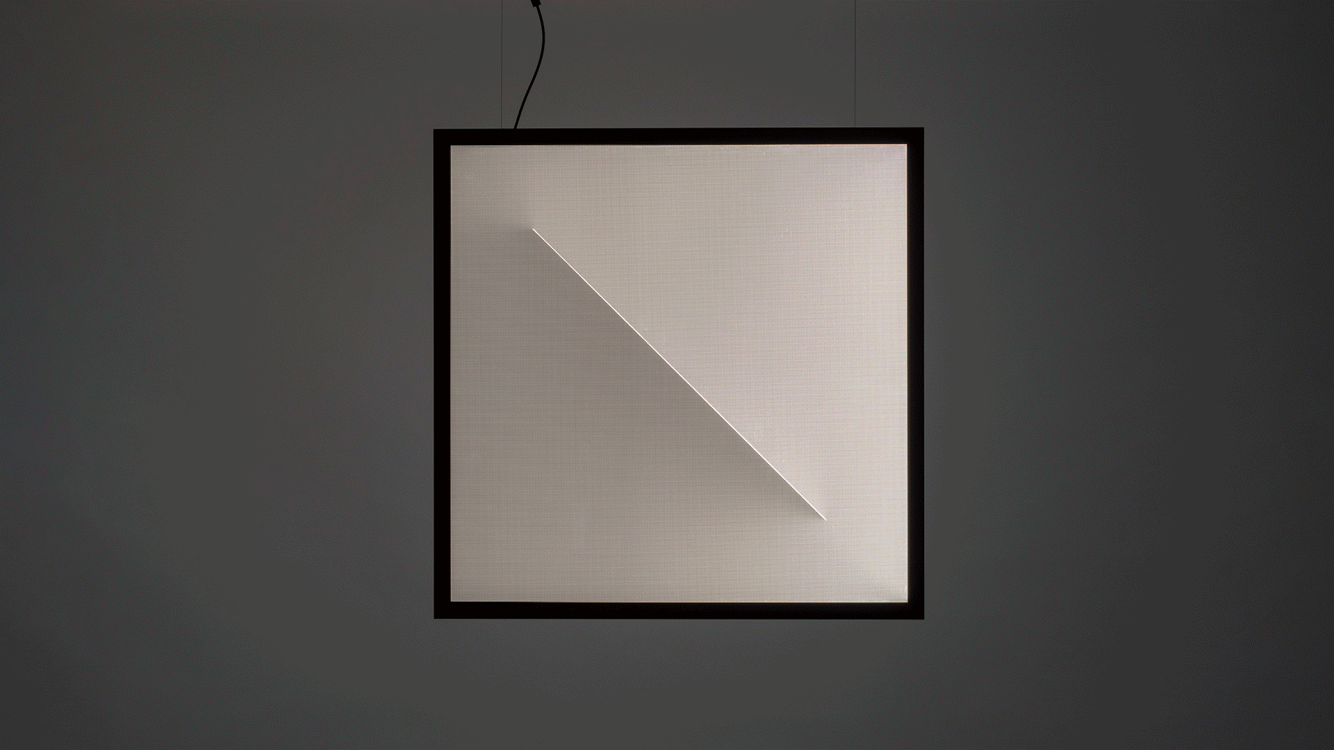 An unexpected touch emerges within this optical algorithm, explored in various forms and sizes. A diagonal cut, reminiscent of Fontana’s canvases, disrupts the surface by splitting it in half. This intervention makes it possible to handle light in two ways. It breaks the uniformity of Discovery’s surface by dividing it into two different light emissions, each perfectly calibrated in its light characteristics.