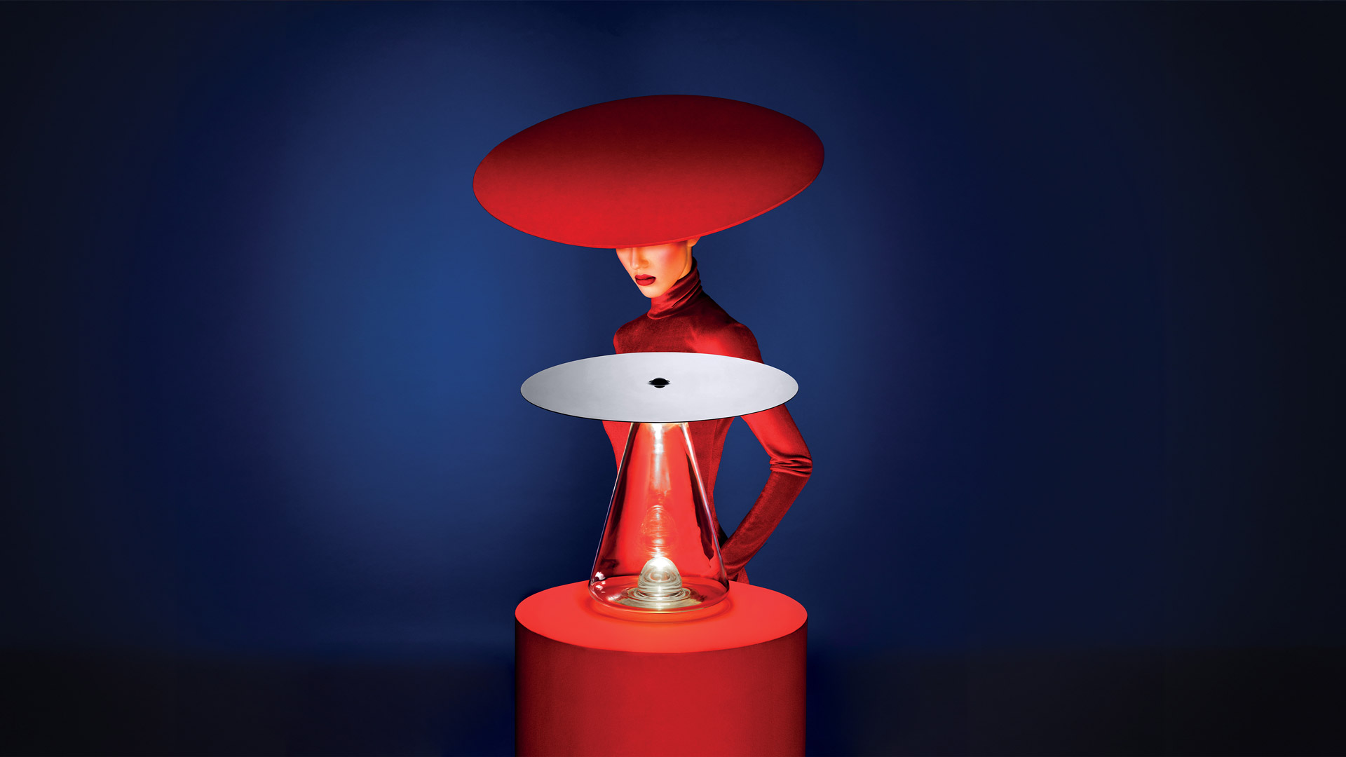 Der Lampenkörper entsteht durch eine einzigartige Geste – eine traditionelle Technik, bei der eine feine Luftblase im Glas eingeschlossen wird. Dieses Detail verleiht dem Design nicht nur eine poetische und ausdrucksstarke Note, sondern bestimmt auch auf optische Weise die erstaunliche Fähigkeit, das Licht auf der umgebenden Fläche gezielt zu steuern und zu modulieren. Eine strategisch platzierte Linse am Sockel lenkt das Licht nach oben, wodurch eine präzise Steuerung ermöglicht wird, die die obere Scheibe je nach Neigung elegant reflektiert.