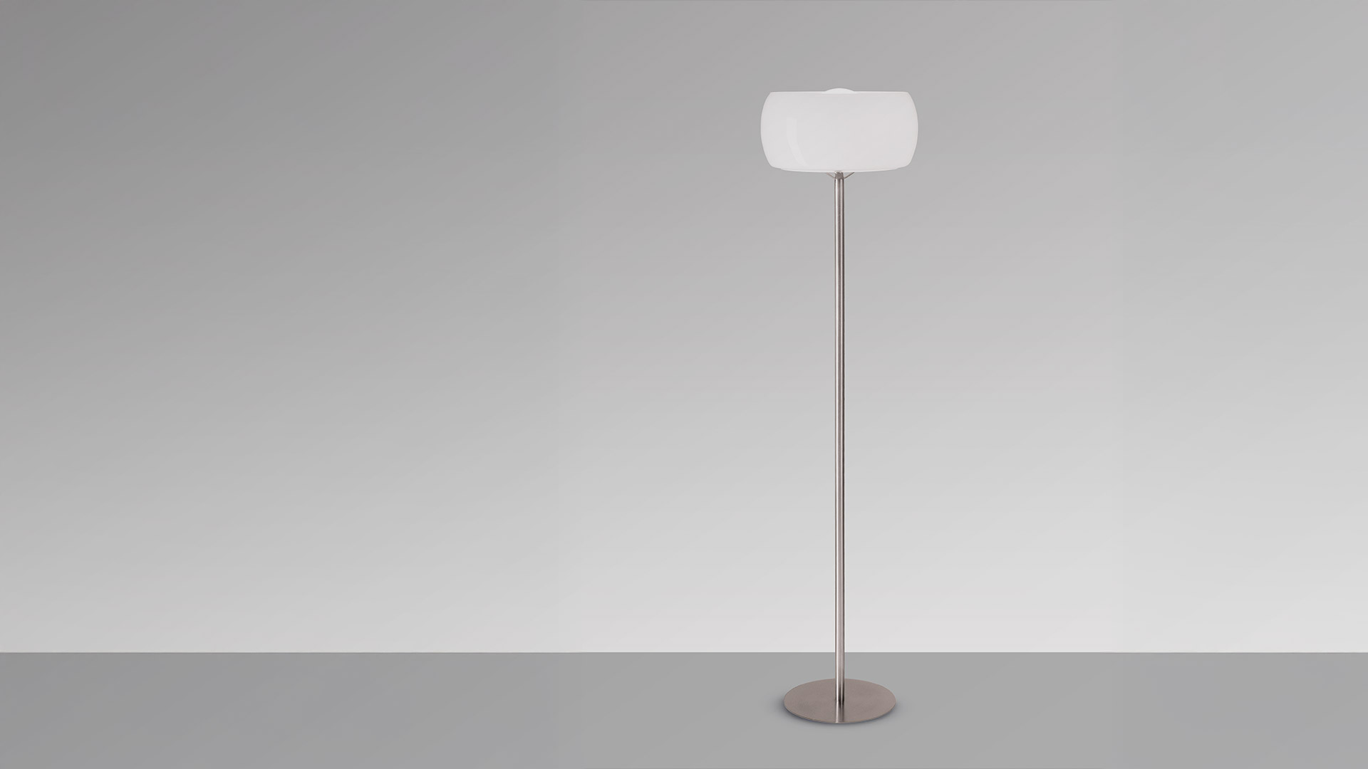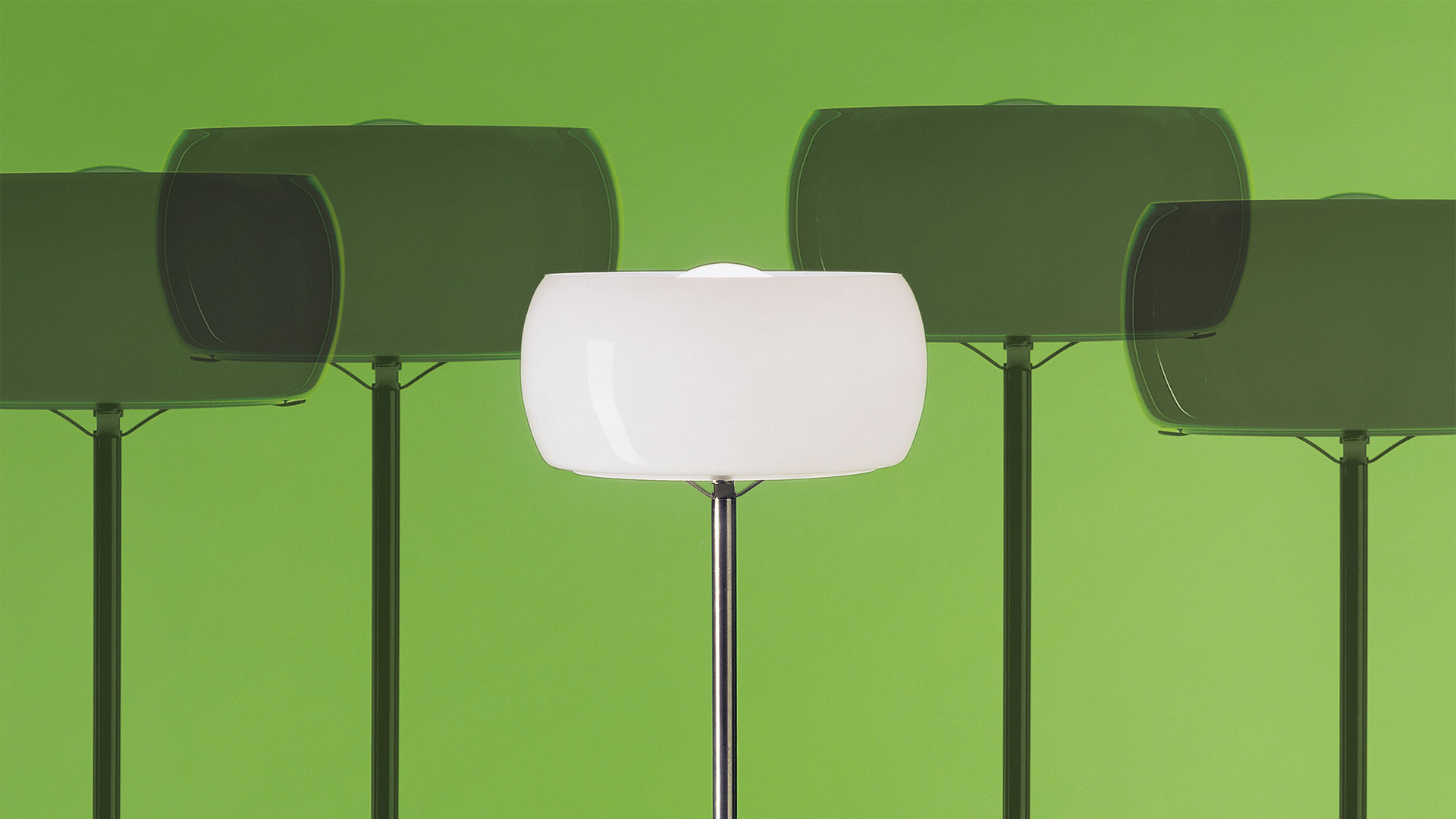 Clitunno greift die Prinzipien von Omega auf und überträgt sie in eine Stehleuchtenversion. Eine geteilte Kugel ruht auf einem Stab, getragen von einer leichten opalenen Innenstruktur – eine Verbindung aus formaler Ausgewogenheit und diffuser Lichtqualität.