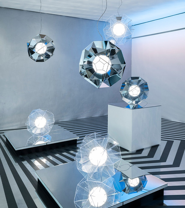 Light installation in the Artemide showroom on Corso Monforte in Milan, with geometric Arctic lamps suspended and placed on mirrored surfaces in a minimal setting.