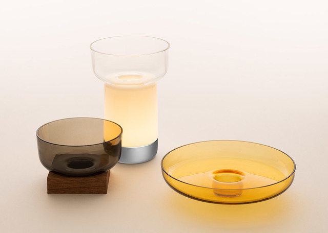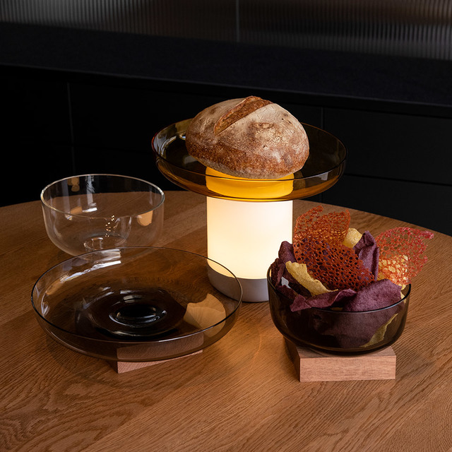 A diffusing body is combined with different bowls. This – and the lamp itself – are made from hand-worked glass, making them unique pieces whose texture, transparency and colour generate a special dialogue between light and food, blurring the boundaries between them.