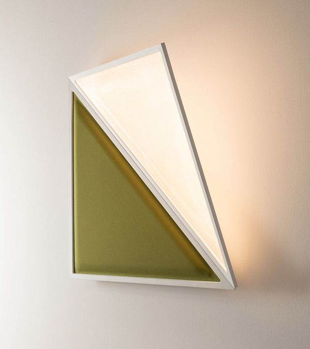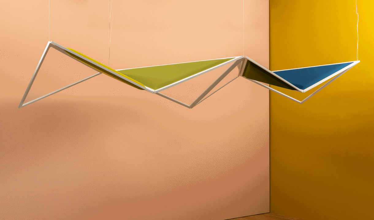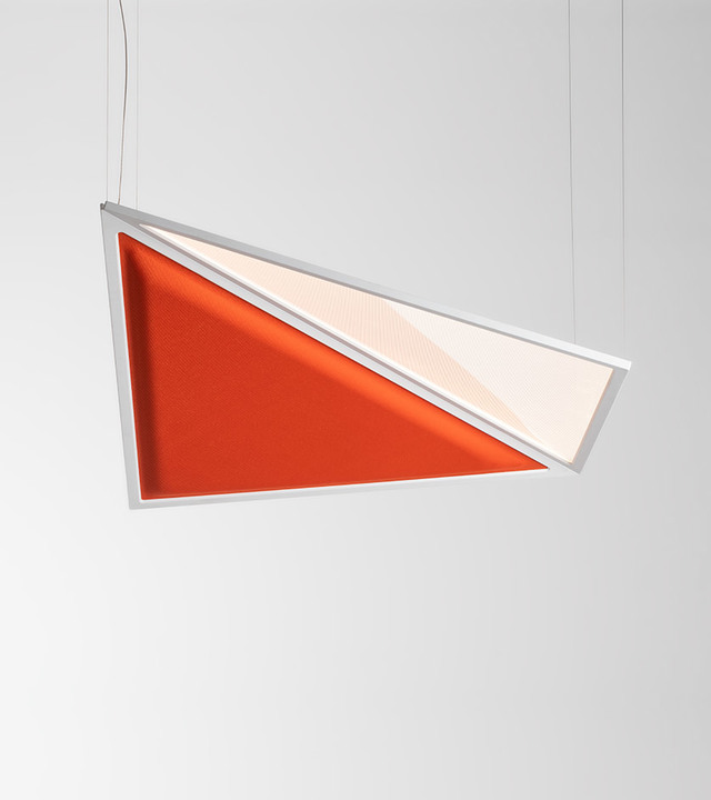 Flexia is composed of two flexible wings, one is an acoustic panel that controls the reverberation by absorbing the sound waves reflected in the environment, the other is a transparent emitting surface that generates a uniform and comfortable light thanks to Discovery's patented technology.