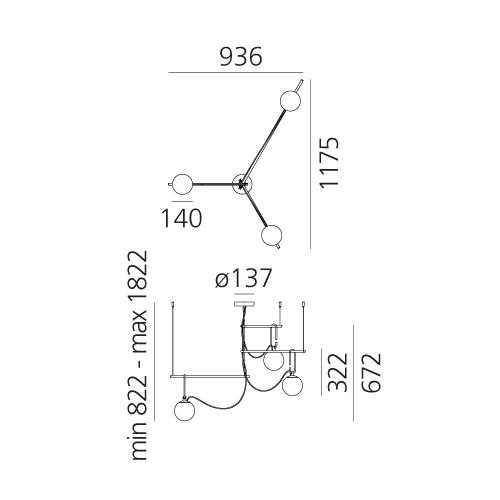 The glass balls and brass rings can slide along the rods, which can be fixed according to an orientation chosen by the customer. The light intensity can only be adjusted with dimmable bulbs. Maximum bulb length 80mm. Maximum bulb diameter: 50mm.