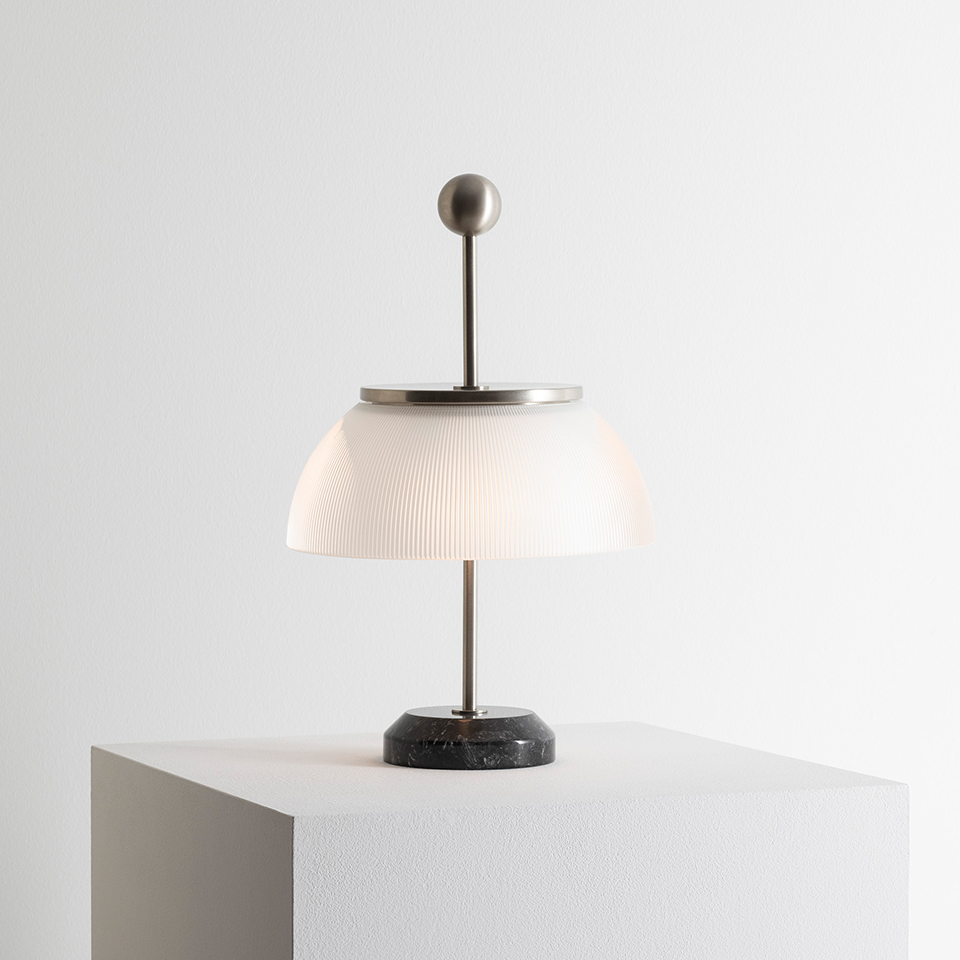 Alfa was the first lamp to feature in the Artemide catalogue the very year the company was founded. Metal structure in opaque nickel-plate; diffuser in crystal glass; base in marble. The metal parts are hand turned.