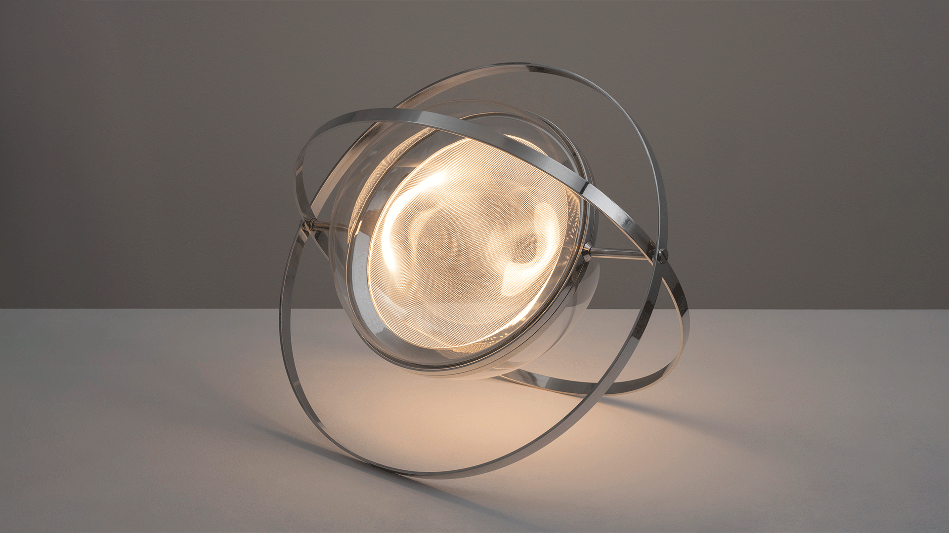 These rings play a structural role, engaging in a dialogue with the surrounding space. They prop up the central core on a tilted axis, adding dynamism and reflecting it on their polished, mirrored surfaces. It is a streamlined structure that evolves with a focus on the relationship between the central light and the shadows it casts in the surroundings.