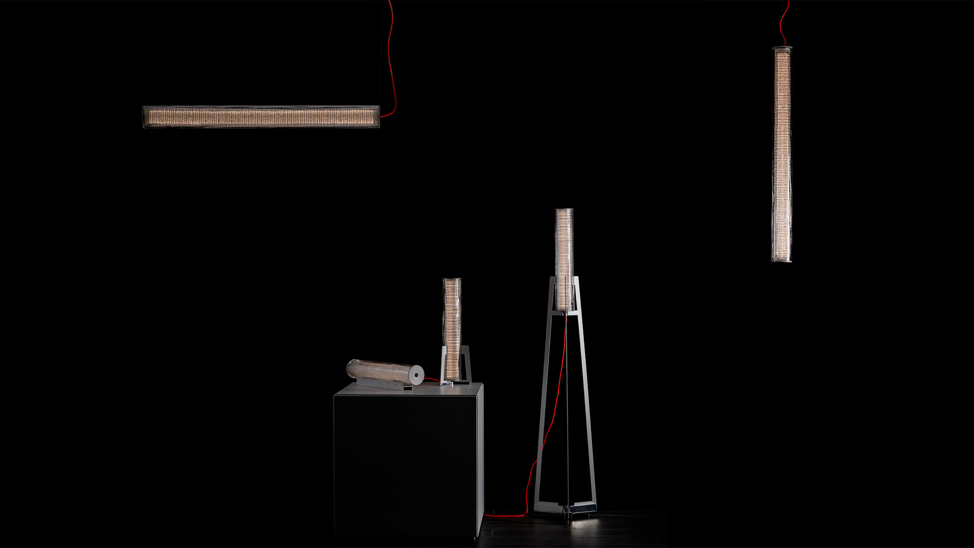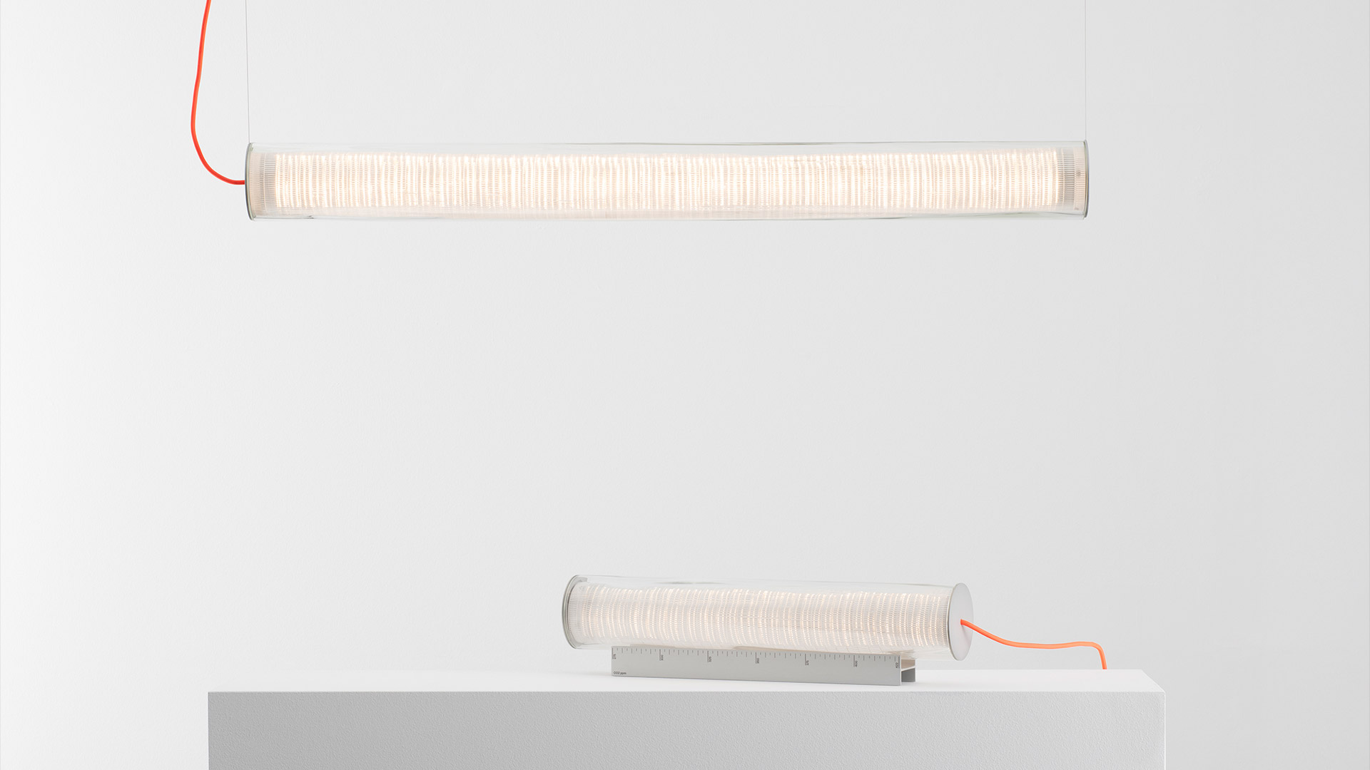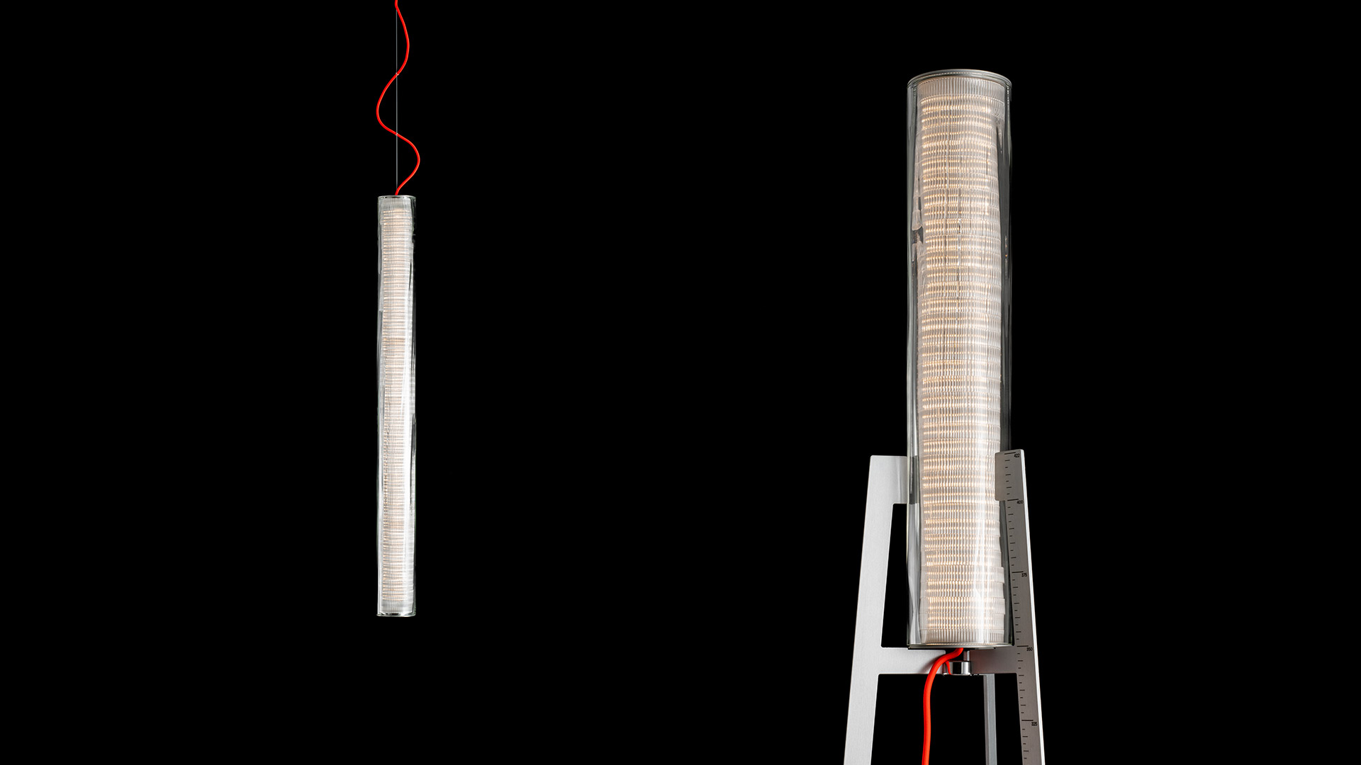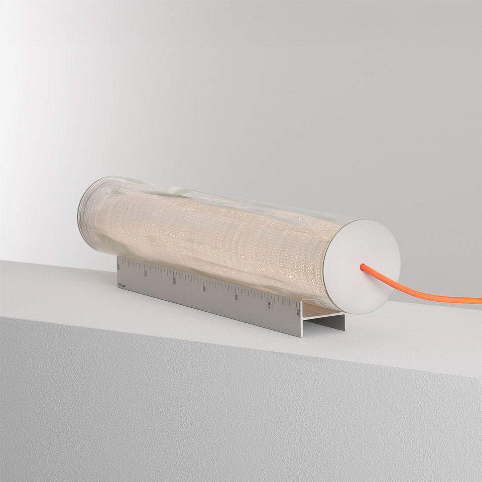 The external blown glass cylinder is the structure inside which the optoelectronic engine disappears without visible shadows. Its limits and its uniqueness are linked to the craftsmanship. Engraving are impressed into the hot glass before blowing and makes its thickness wavy and irregular.