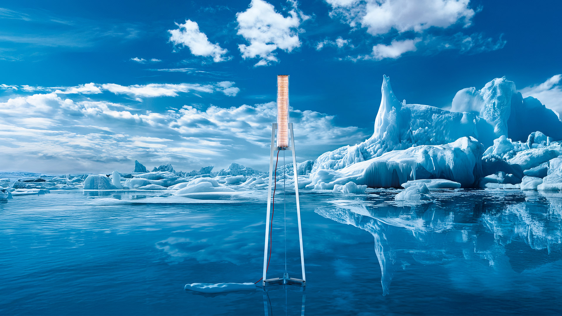 The quintessential marker of climate change is thus the Ice Core, a cylinder of stratified ice extracted from the depths of our planet’s ice sheets. The Ice Core thus becomes the element that creates awareness and calls to action. Abandoning its frozen form, the Ice Core of Criosfera consists of a layering of blown recycled glass with an optic core that learns from the refractive nature of the ice surface of the Antarctic plateau to maximise the diffusion of light, and evokes the stratification of the polar ice."