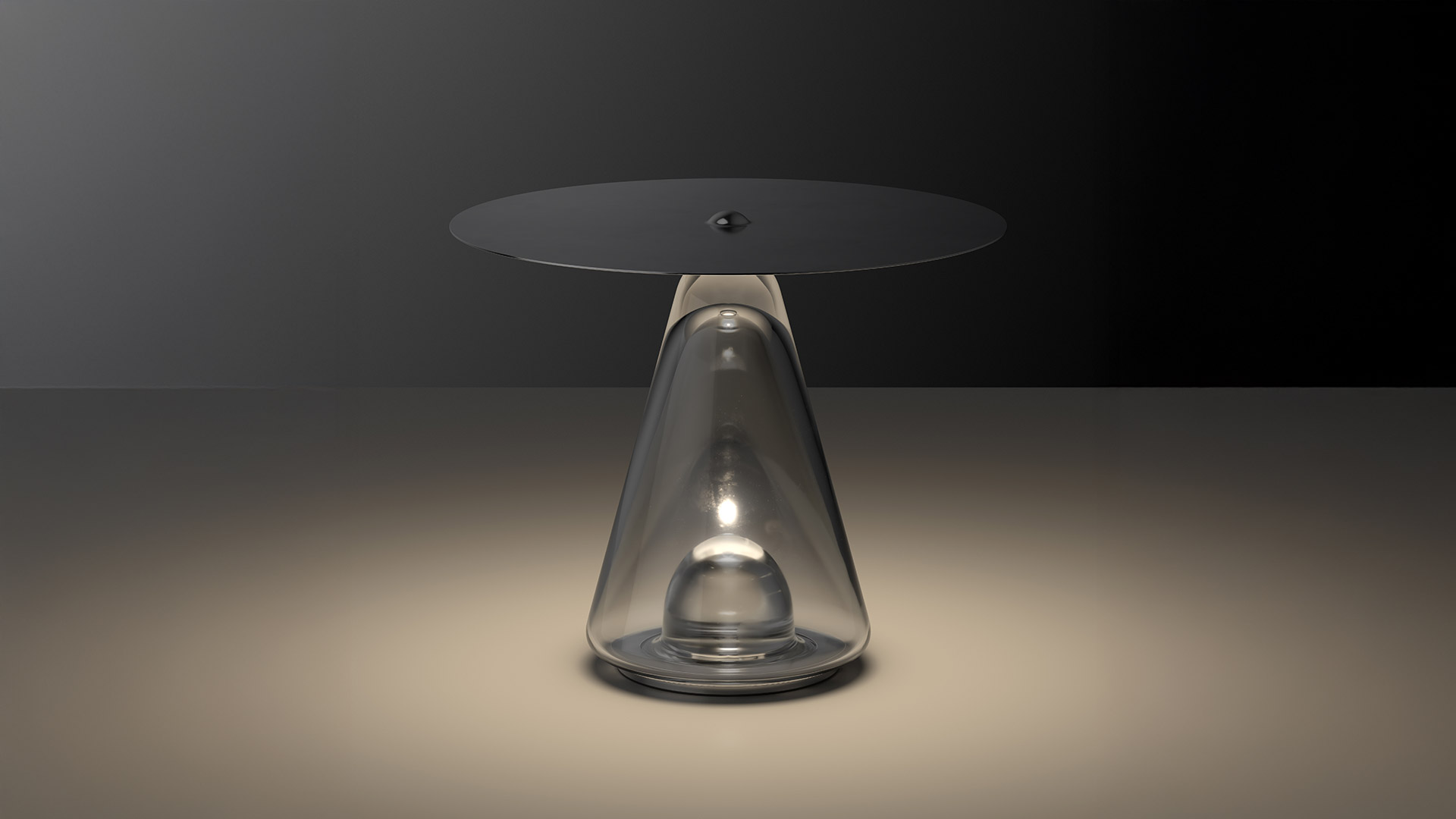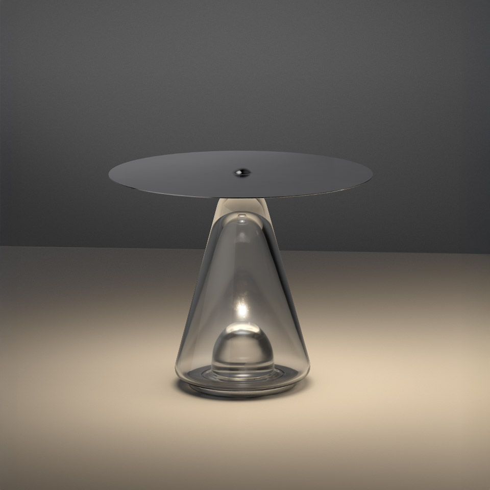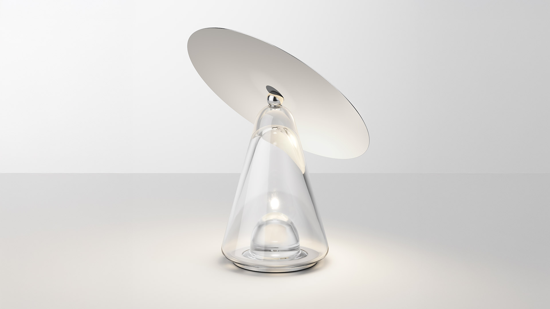 The body of the lamp takes shape through a unique gesture—a traditional technique that incorporates a delicate air bubble within the glass. This feature not only adds a poetic and evocative touch to the design, but also defines its surprising ability to control and modulate light across surrounding surfaces. A strategically placed lens at the base directs the light upward, allowing for precise control that the upper disc reflects gracefully, depending on its angle.