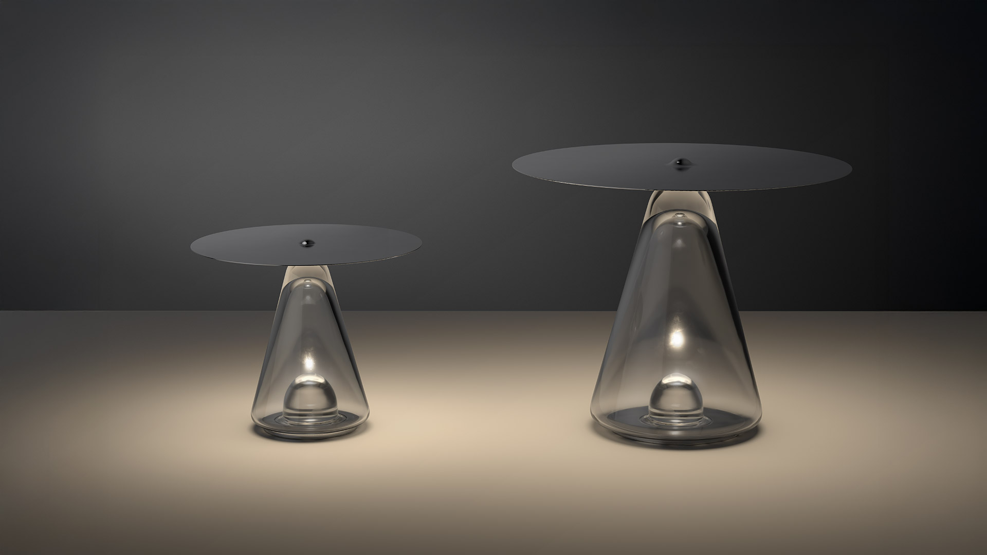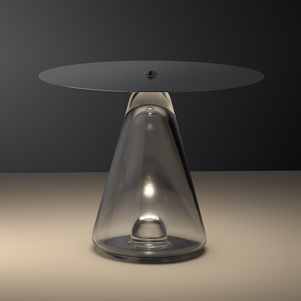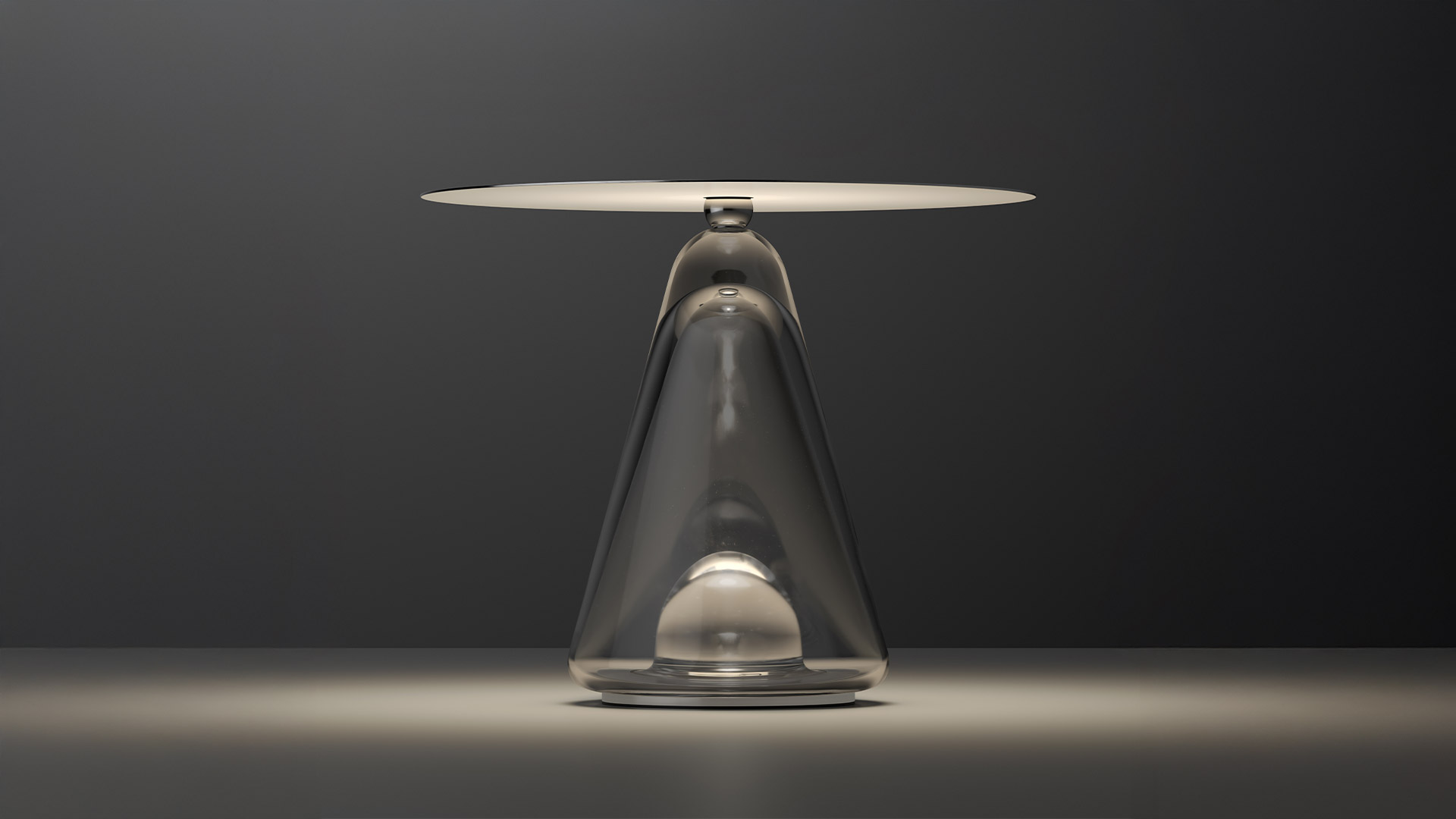 The body of the lamp takes shape through a unique gesture—a traditional technique that incorporates a delicate air bubble within the glass. This feature not only adds a poetic and evocative touch to the design, but also defines its surprising ability to control and modulate light across surrounding surfaces. A strategically placed lens at the base directs the light upward, allowing for precise control that the upper disc reflects gracefully, depending on its angle.