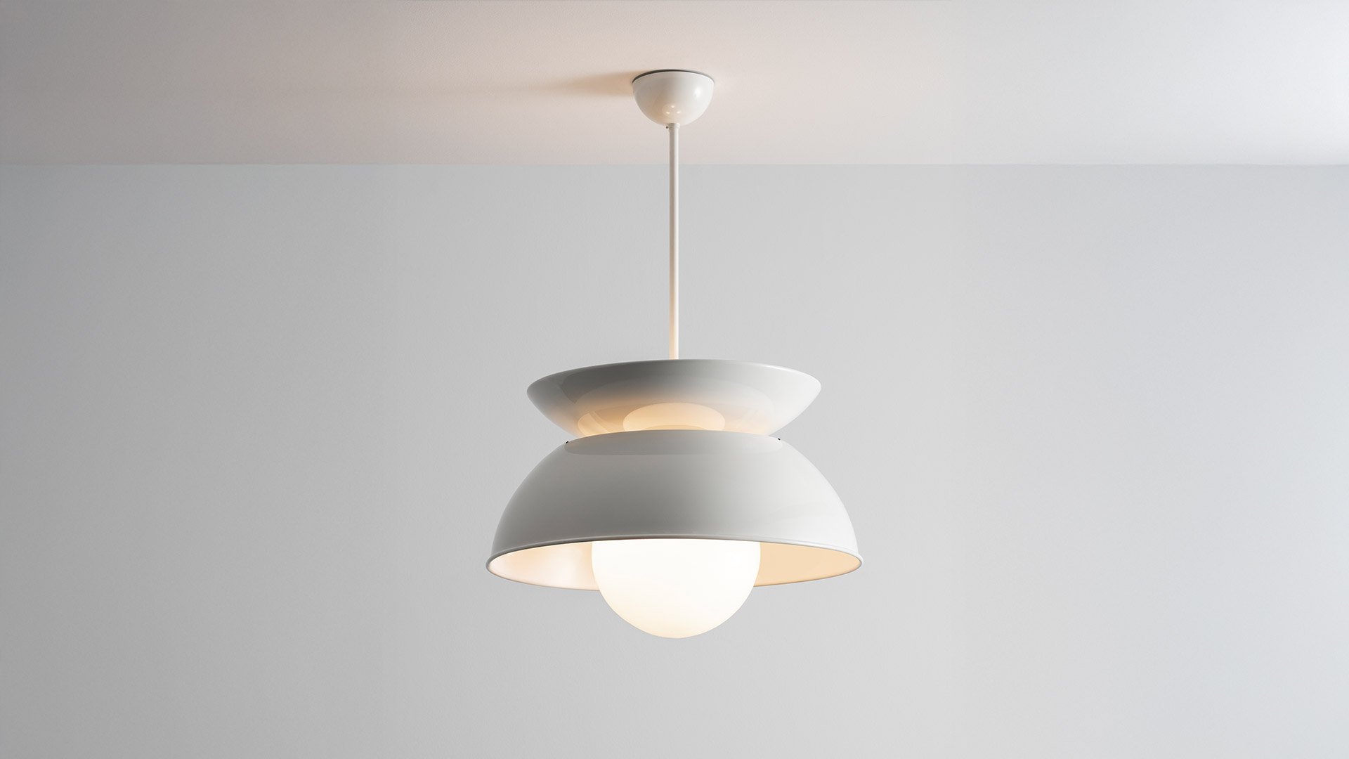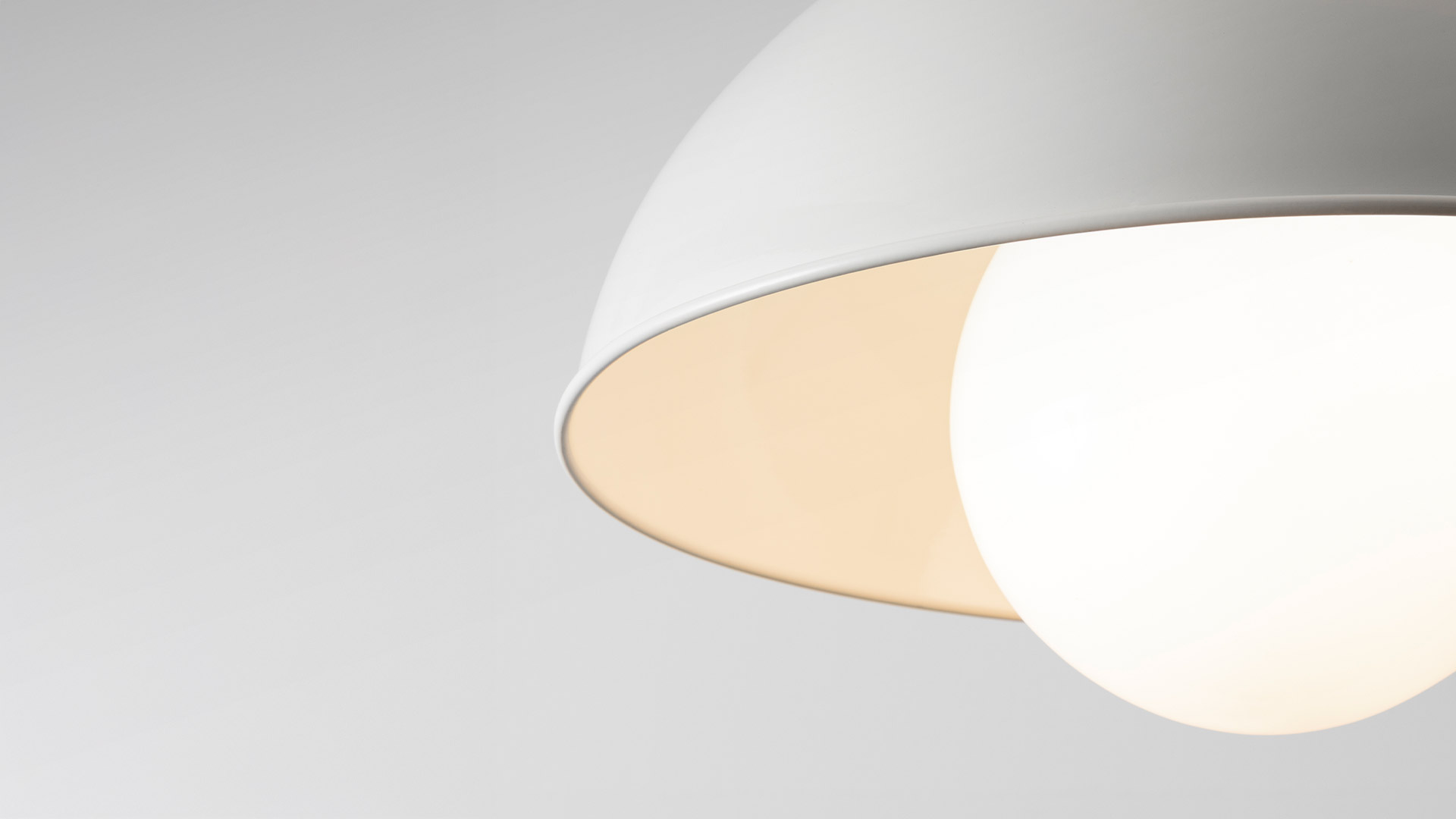 The two metal hemispheres can be lacquered in white or finished in nickel. The upper half conceals indirect emission, while the lower section holds the opaline glass globe that softly spreads light throughout the space.