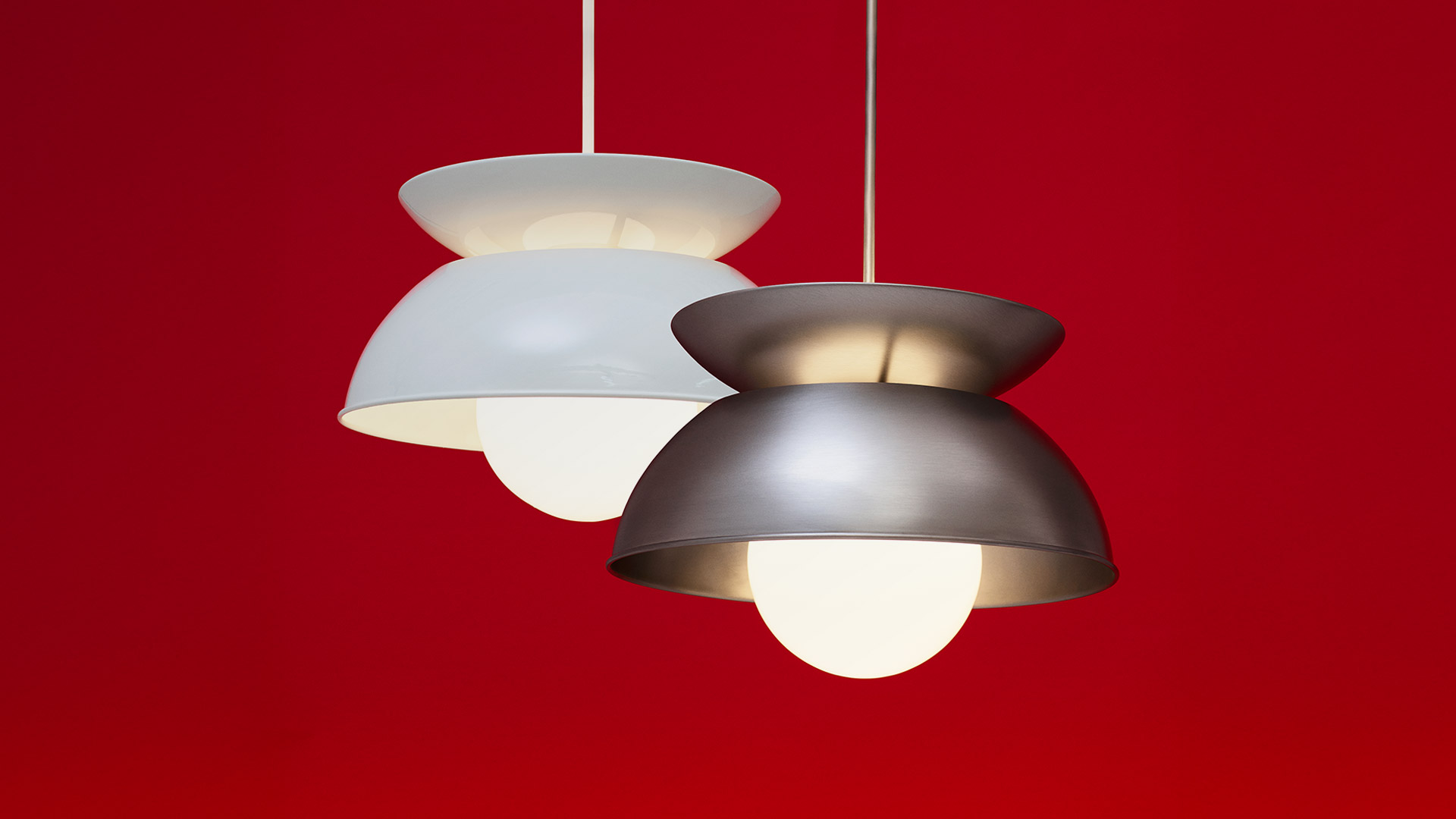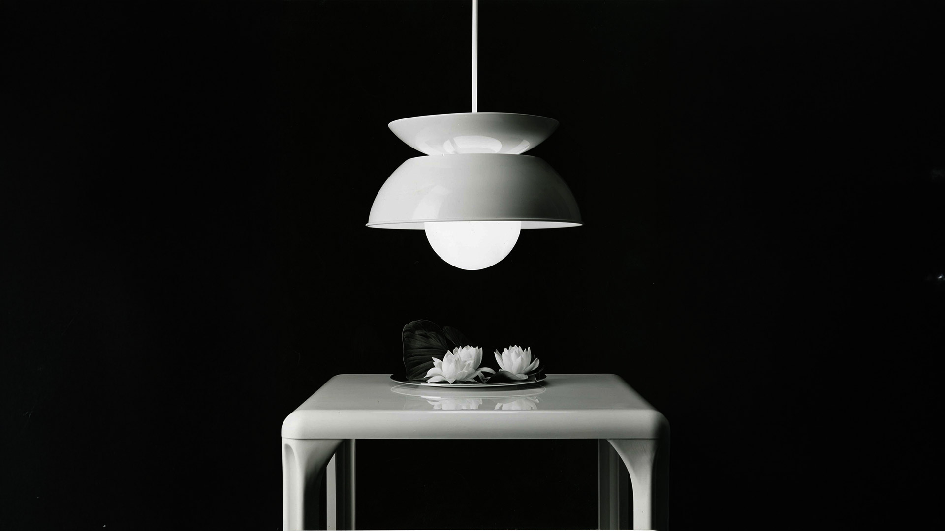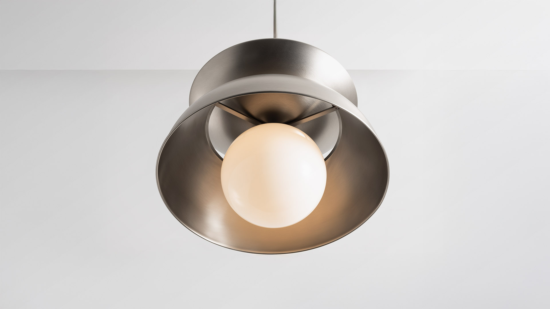 Cetra is a sculptural suspension lamp that combines pure forms interacting with light through different materials—diffusing, shielding, or reflecting it.