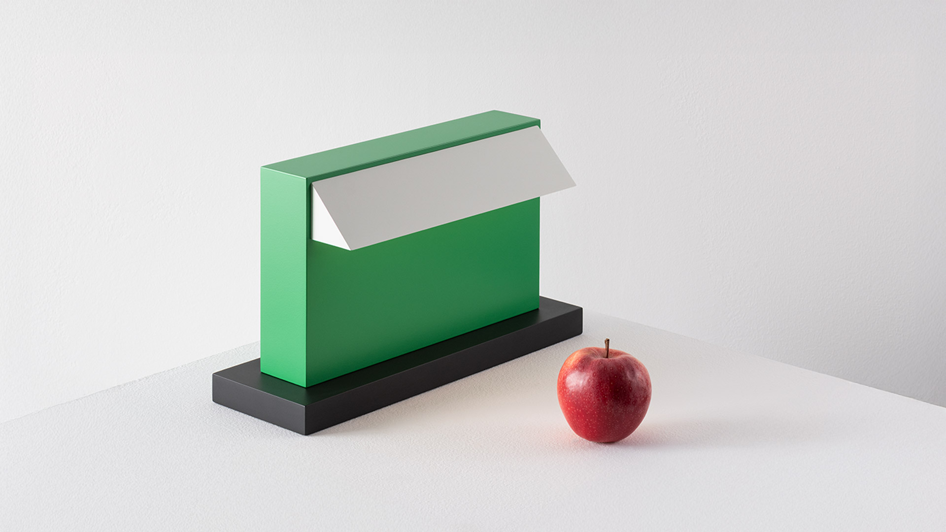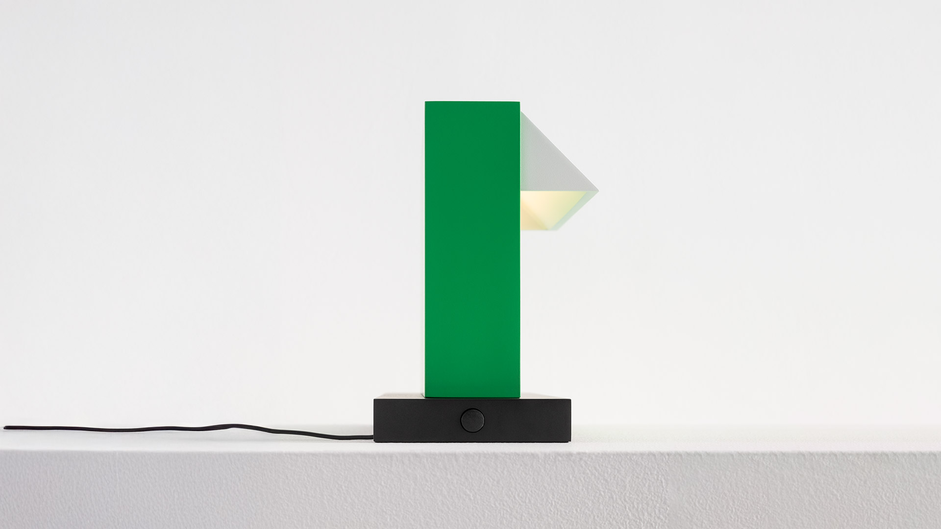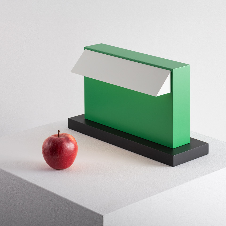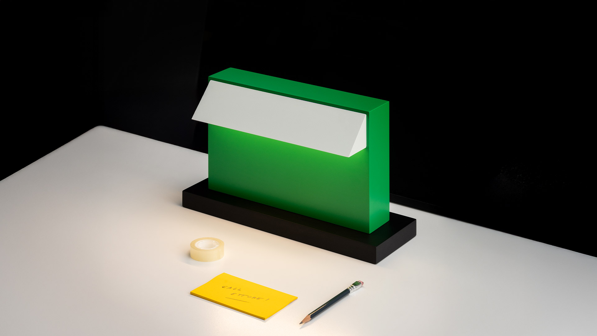 Designed in 1982, Hera is a table lamp that follows the model of the traditional ministerial lamp, like its near-contemporary Pausania, but reinterprets it through clean, solid forms and bold, overlapping blocks of colour.