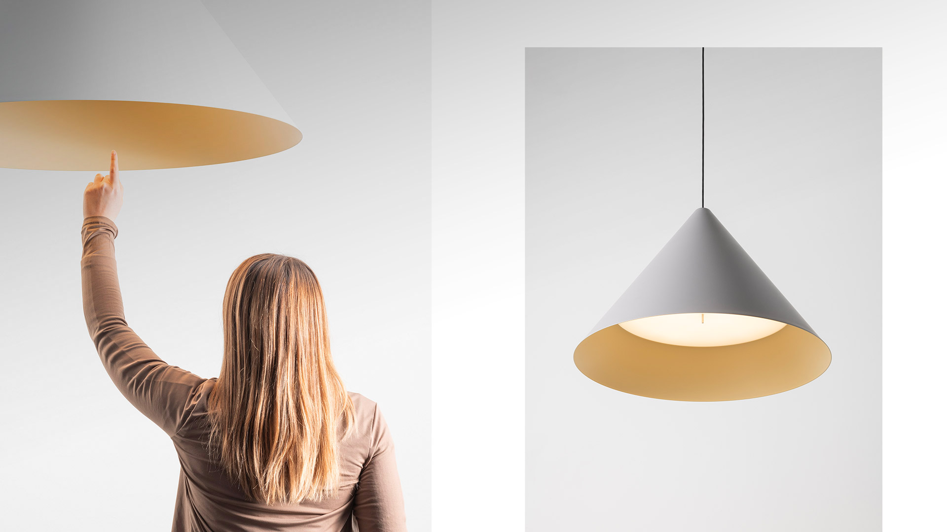 Vea suspension features a simple conical form that enhances its perceptual richness. The recessed diffuser houses a slender metal cylinder at its centre, allowing direct adjustment of the light intensity.
