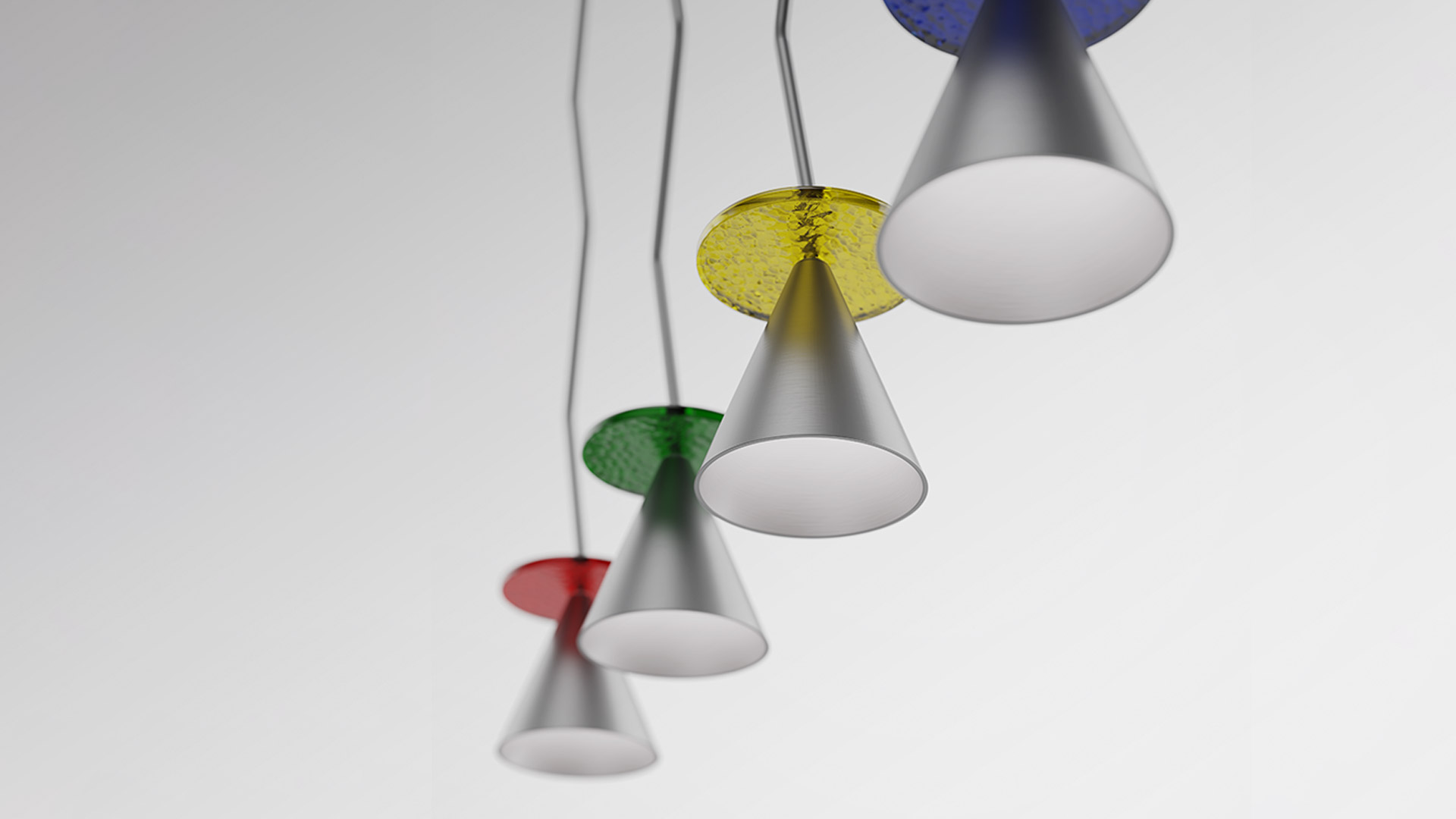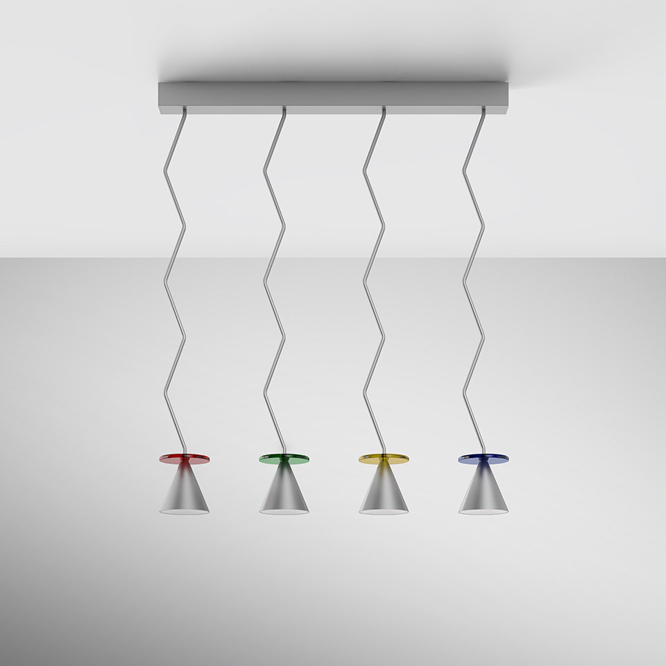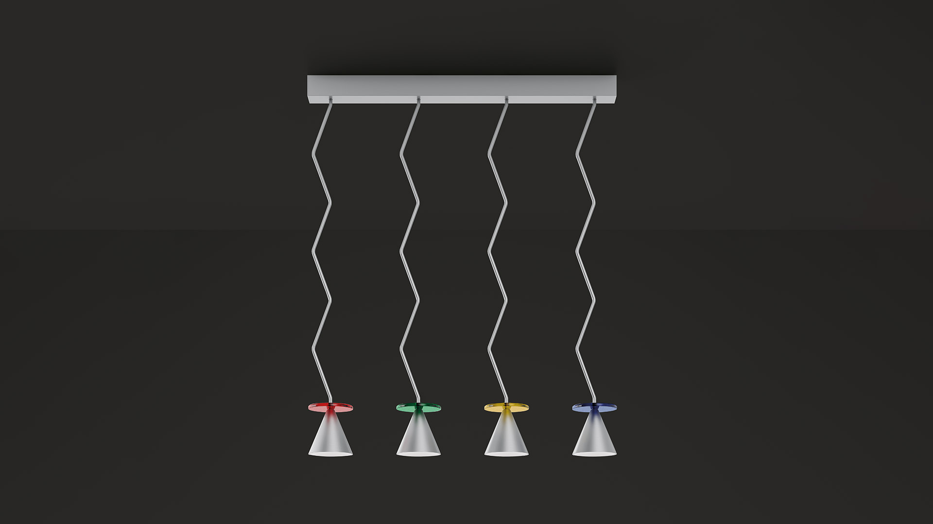 Orfeo, designed in 1986, is a suspension lamp composed of four small conical shades arranged in sequence and supported by zigzag rods.
