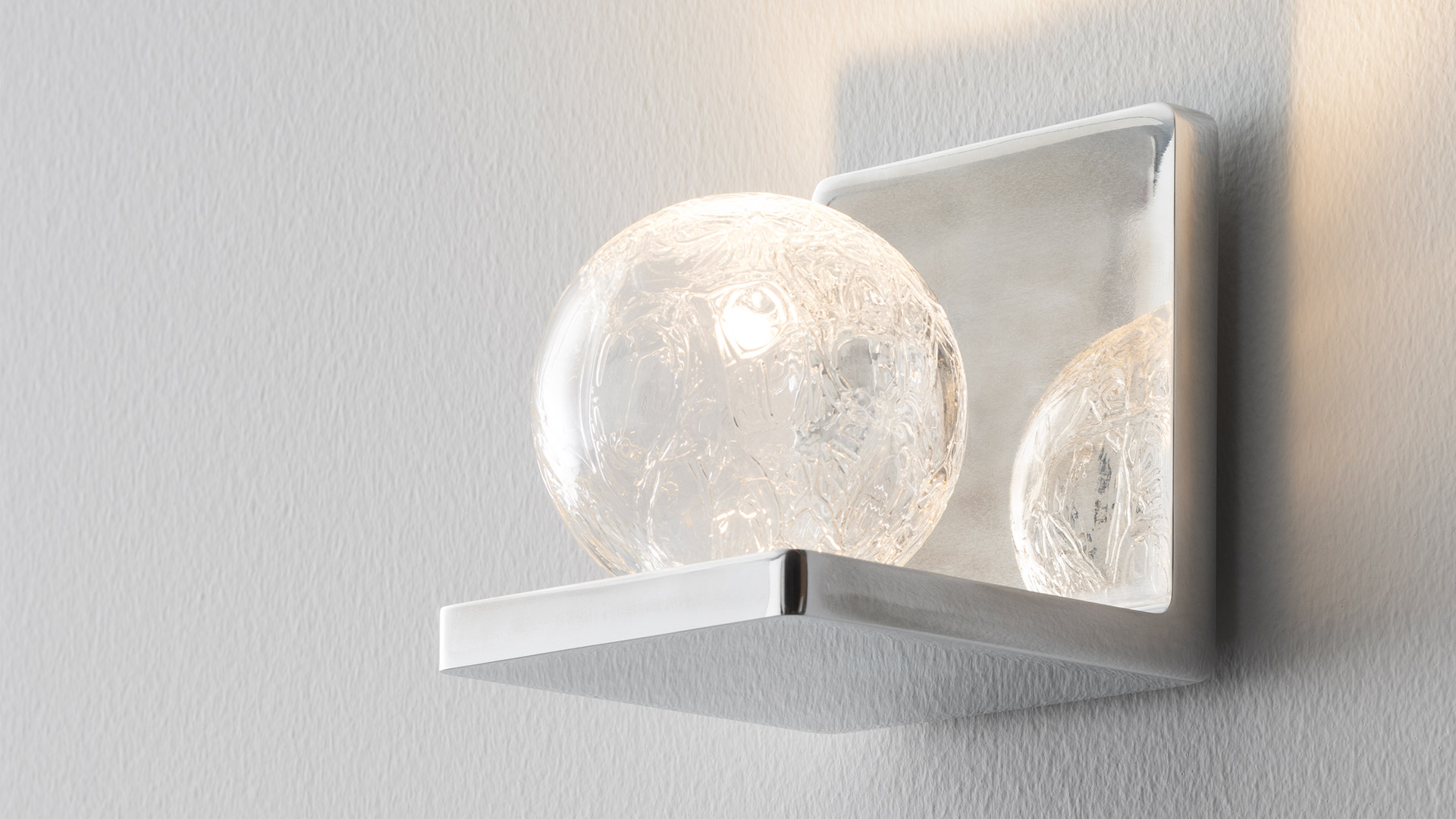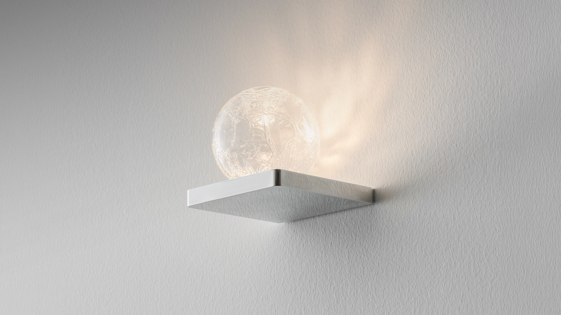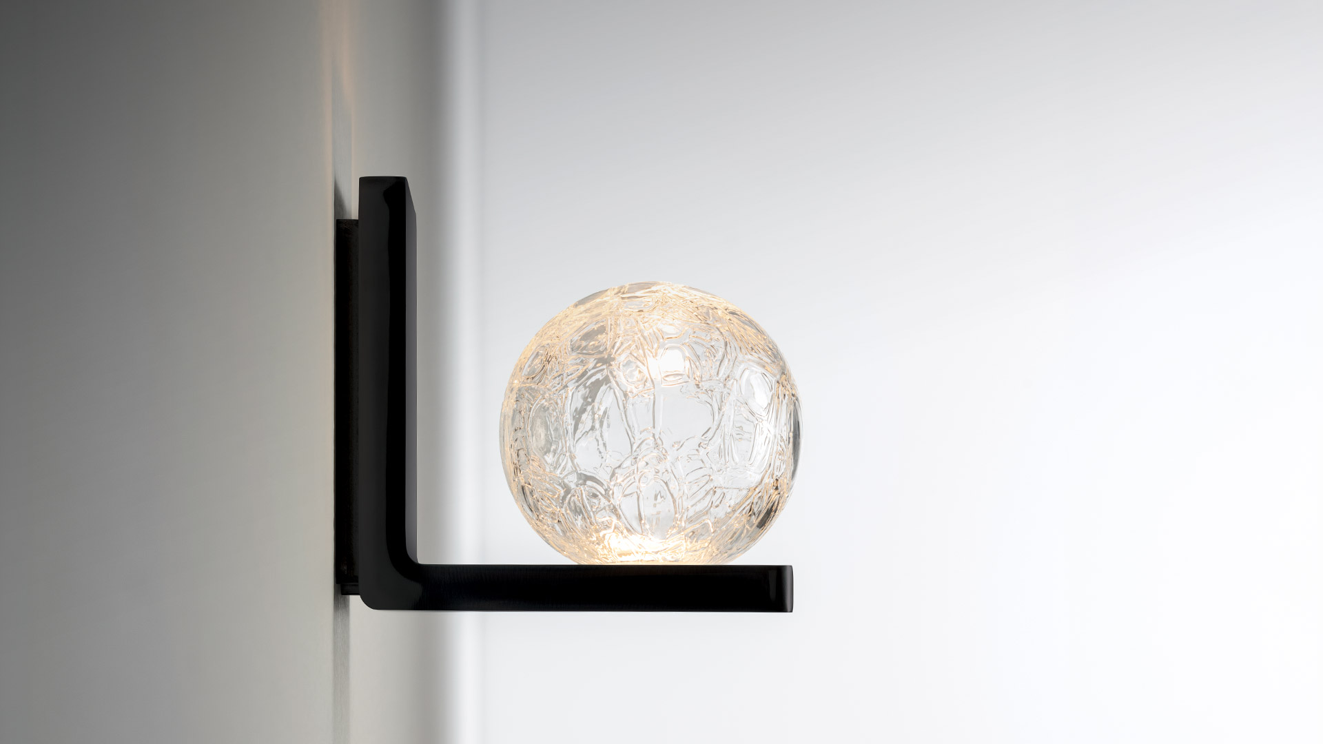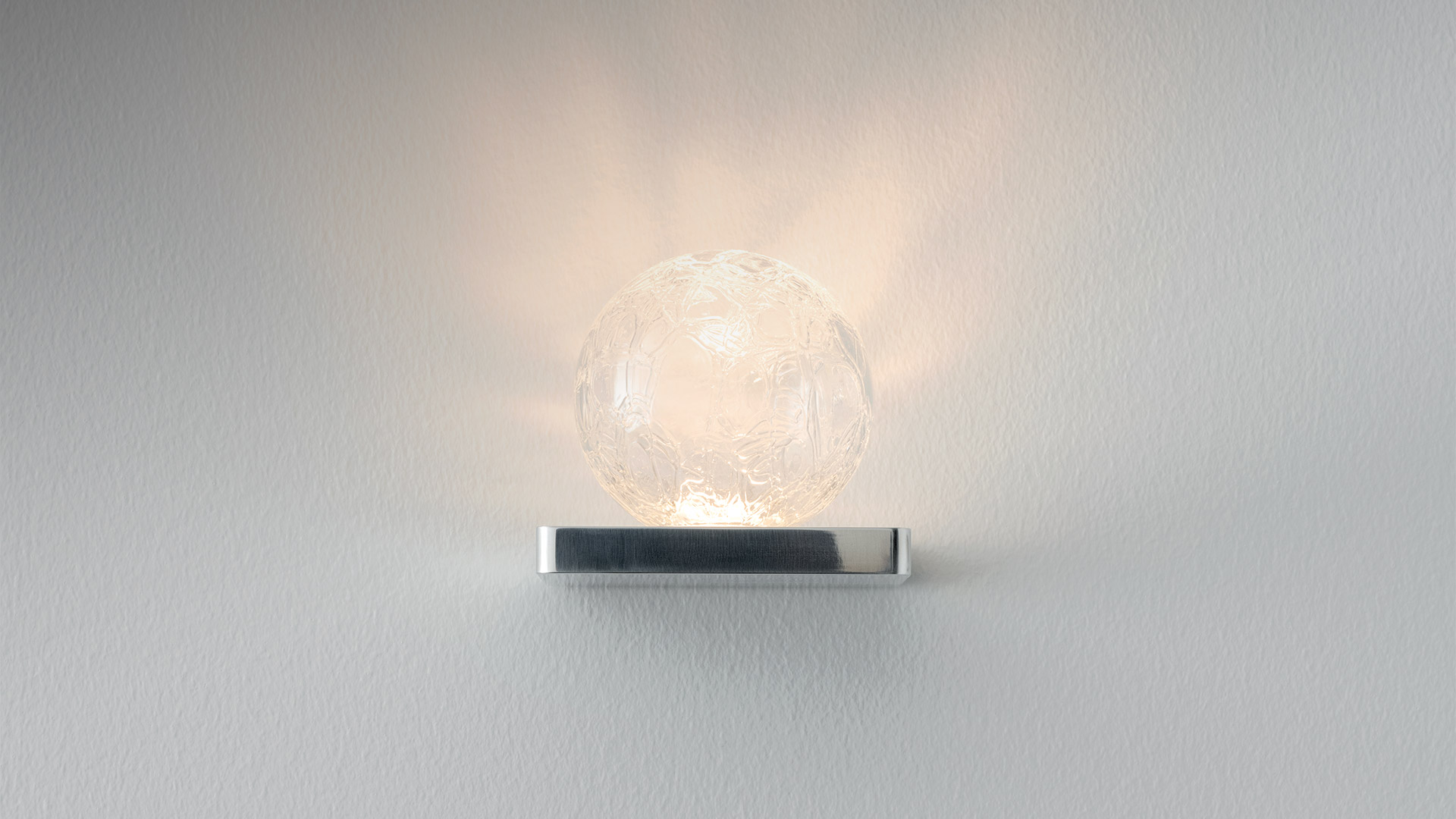 Ulrich und Diotima brings geometric rigor into dialogue with material richness. The minimalist bases, available in a compact version or with an L-shaped profile, support a sphere in Craquelé blown glass, created through thermal shock to produce a unique texture of micro surface fractures. Light passes through the glass, animating the surface and casting delicate reflections into the space. The integration of mains-voltage LEDs reduces bulk and optimizes components while maintaining high lighting quality. It is a collection that balances formal essentiality with decorative expressiveness.
