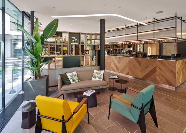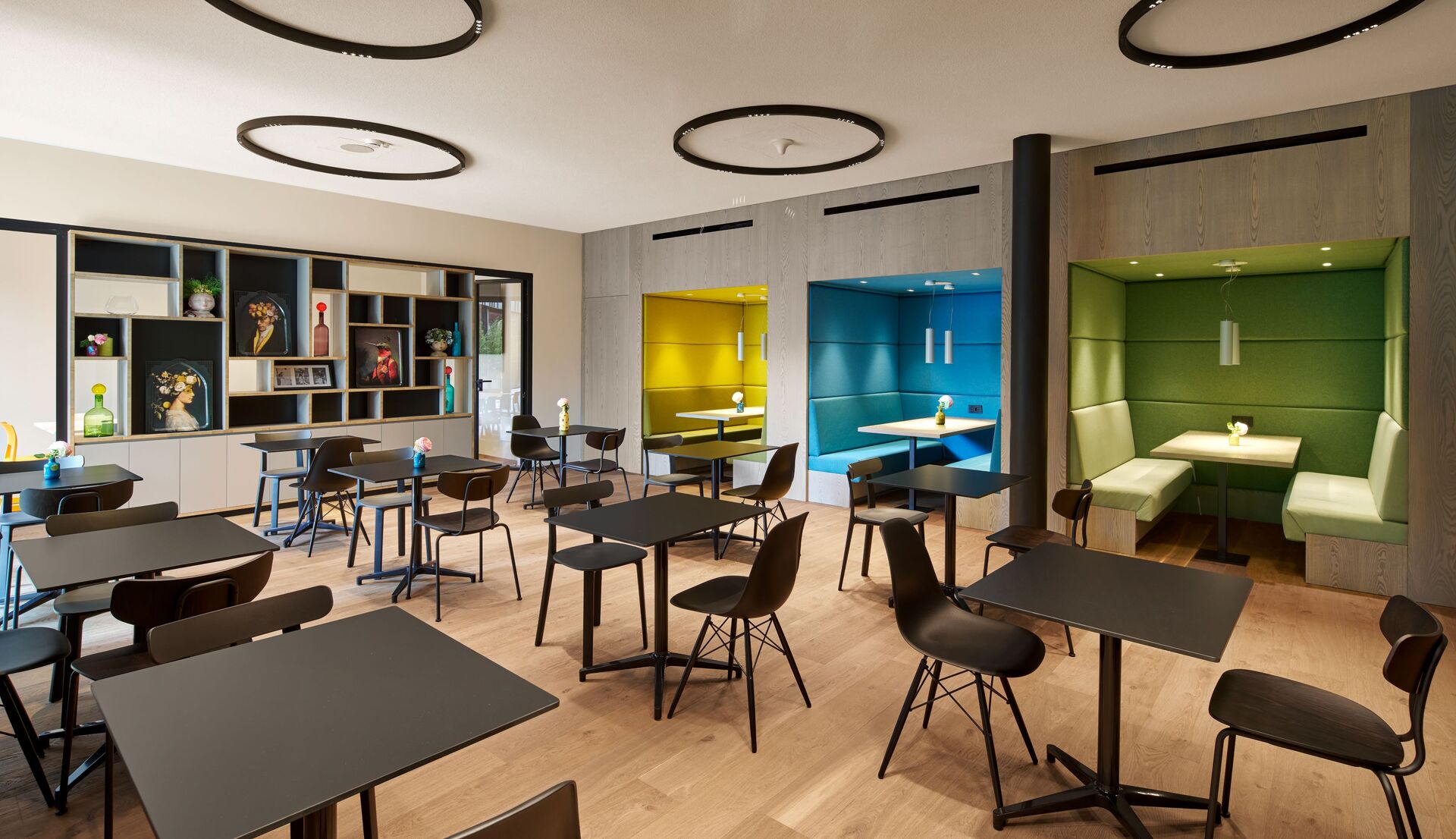 Image of the restaurant area inside the hotel illuminated by A.24 Stand-Alone Circular and Tagora Suspension.
