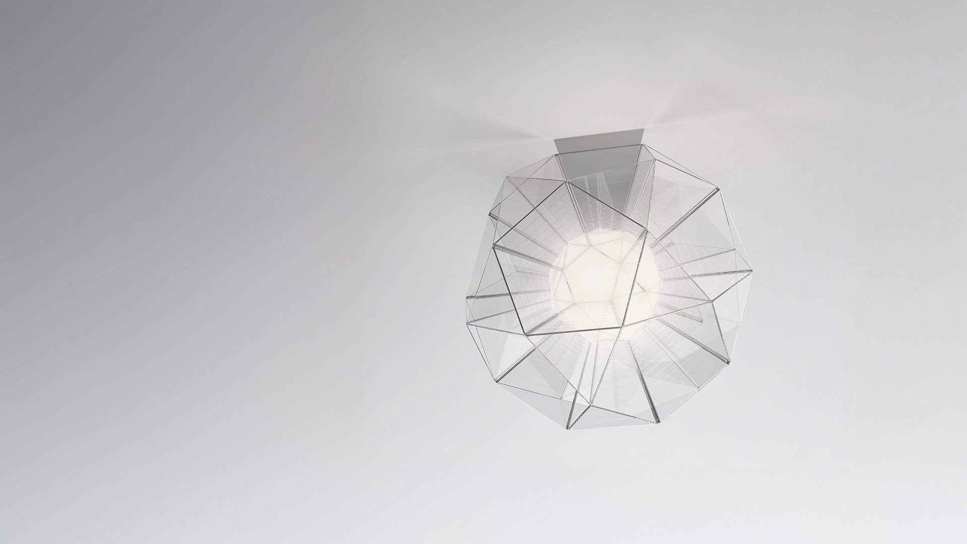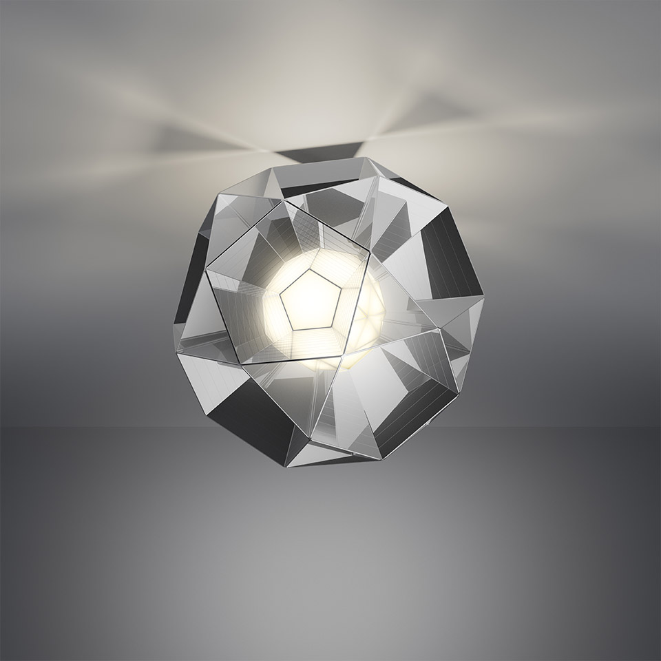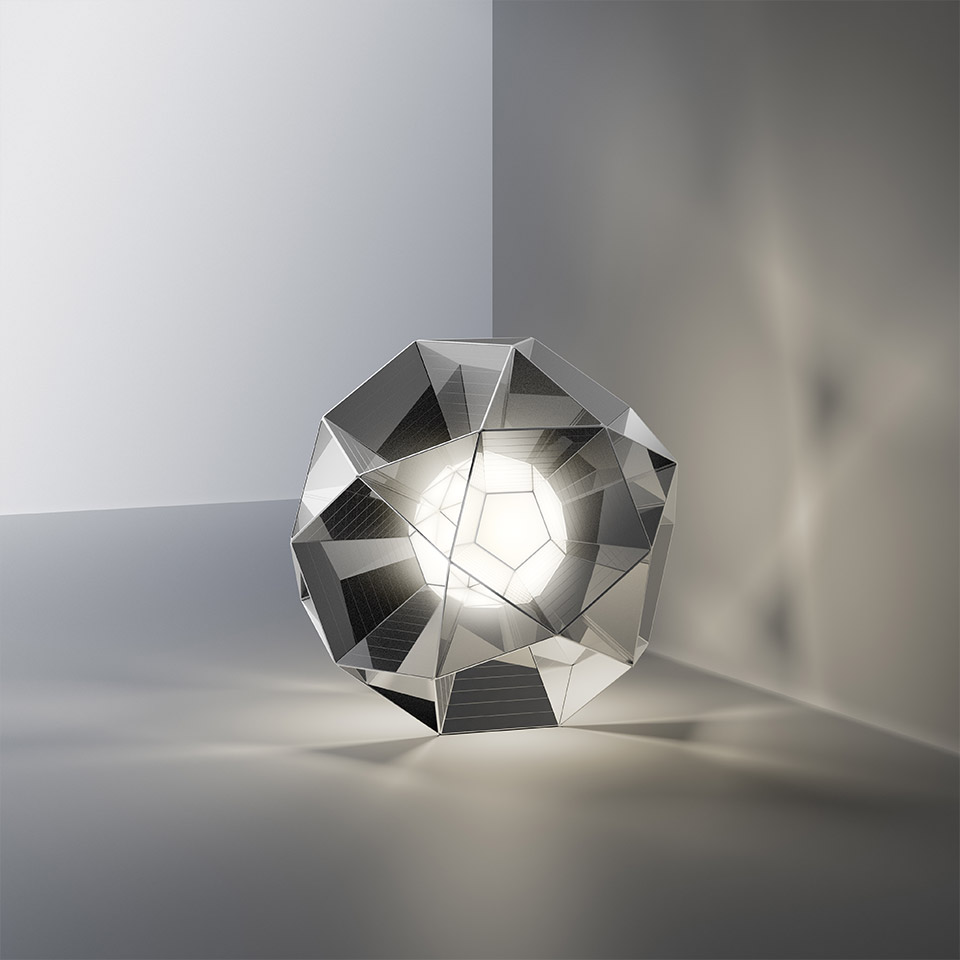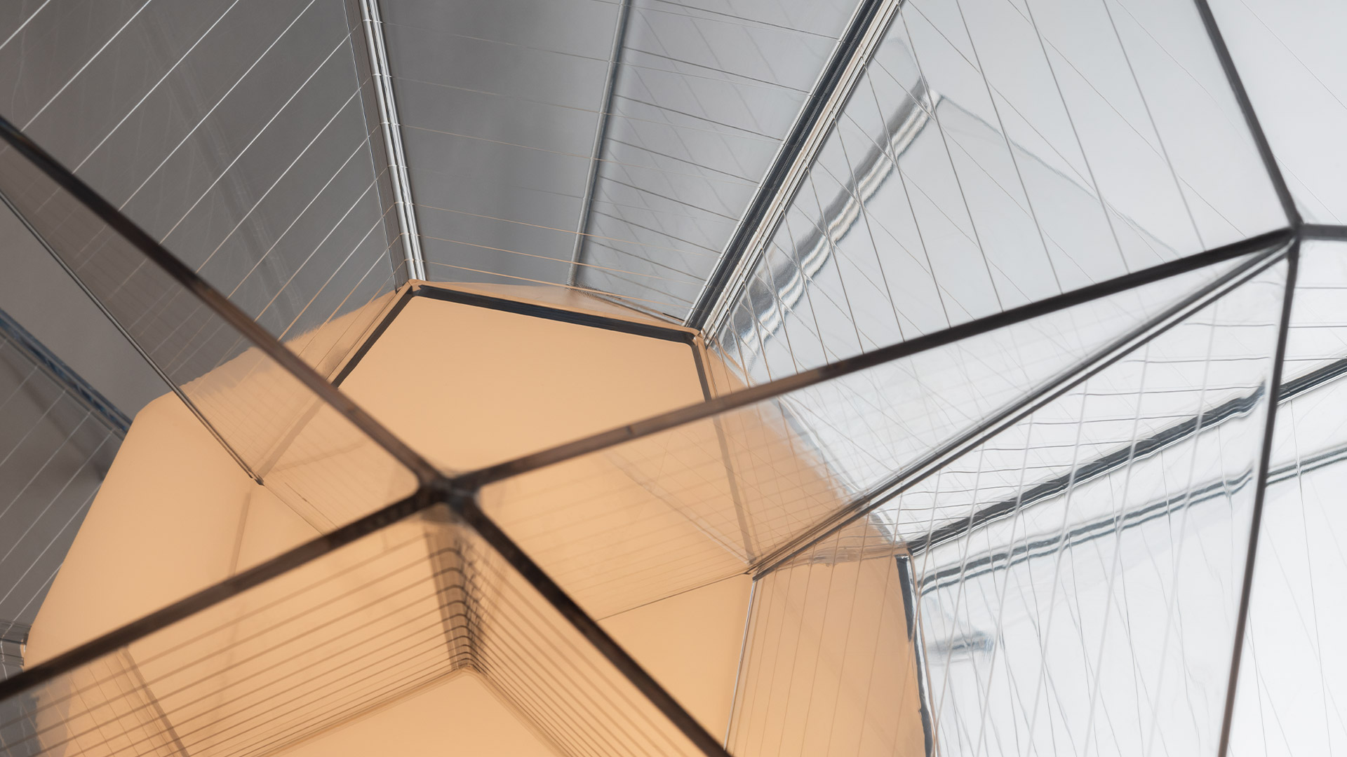La structure finale évoque un solide d’Archimède, sans surfaces extérieures visibles : elle prend forme à partir de faces pentagonales projetées depuis un centre qui abrite une sphère diffusante.