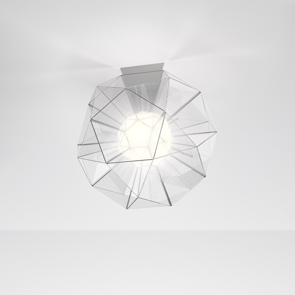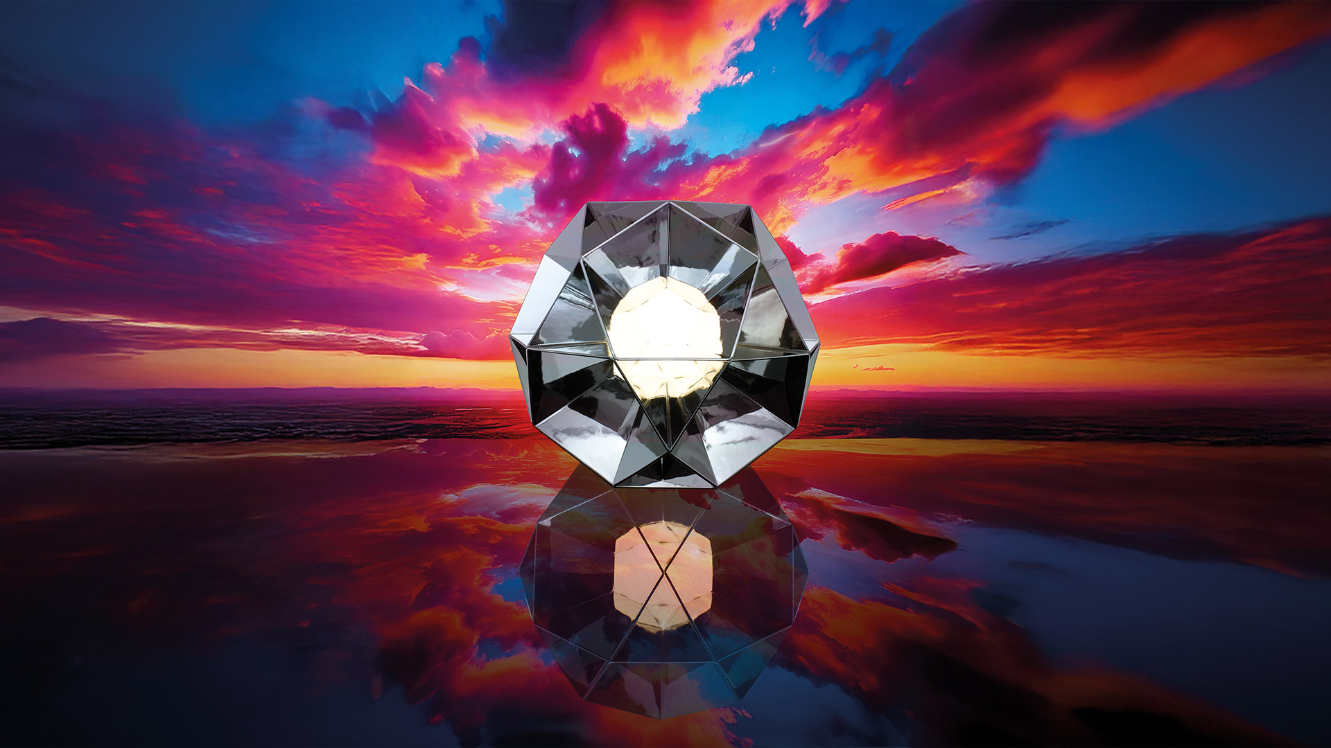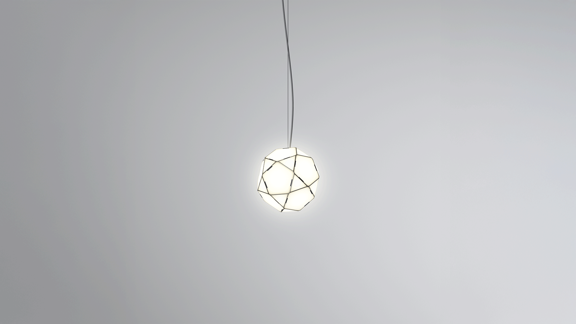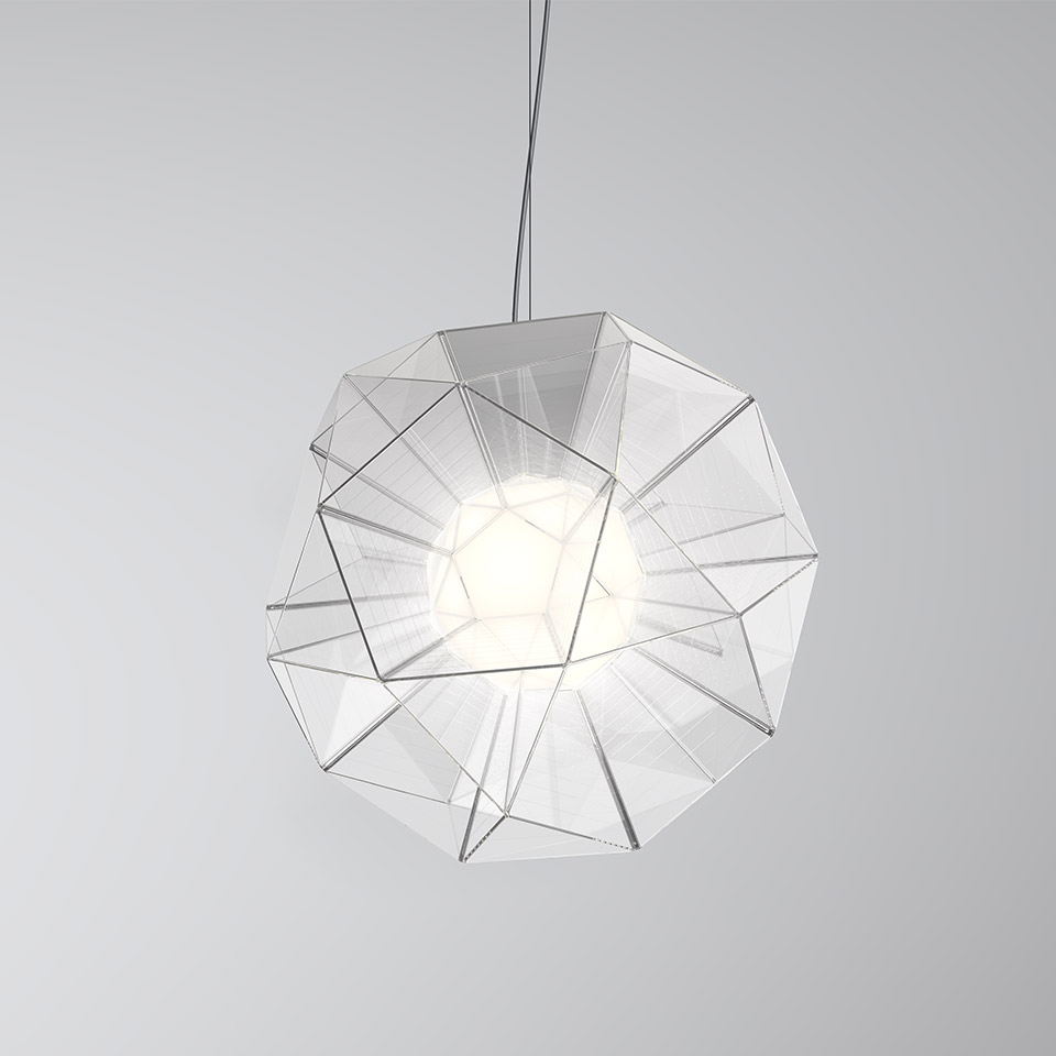 La structure finale évoque un solide d’Archimède, sans surfaces extérieures visibles : elle prend forme à partir de faces pentagonales projetées depuis un centre qui abrite une sphère diffusante.