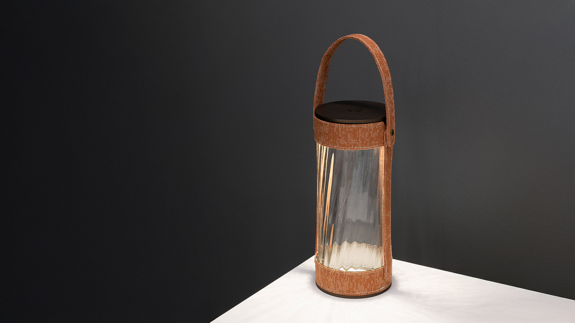 Laya est une lanterne portable qui associe du verre soufflé nervuré à des habillages en tissu interchangeables.