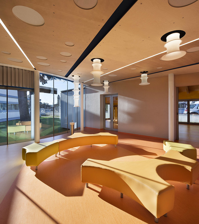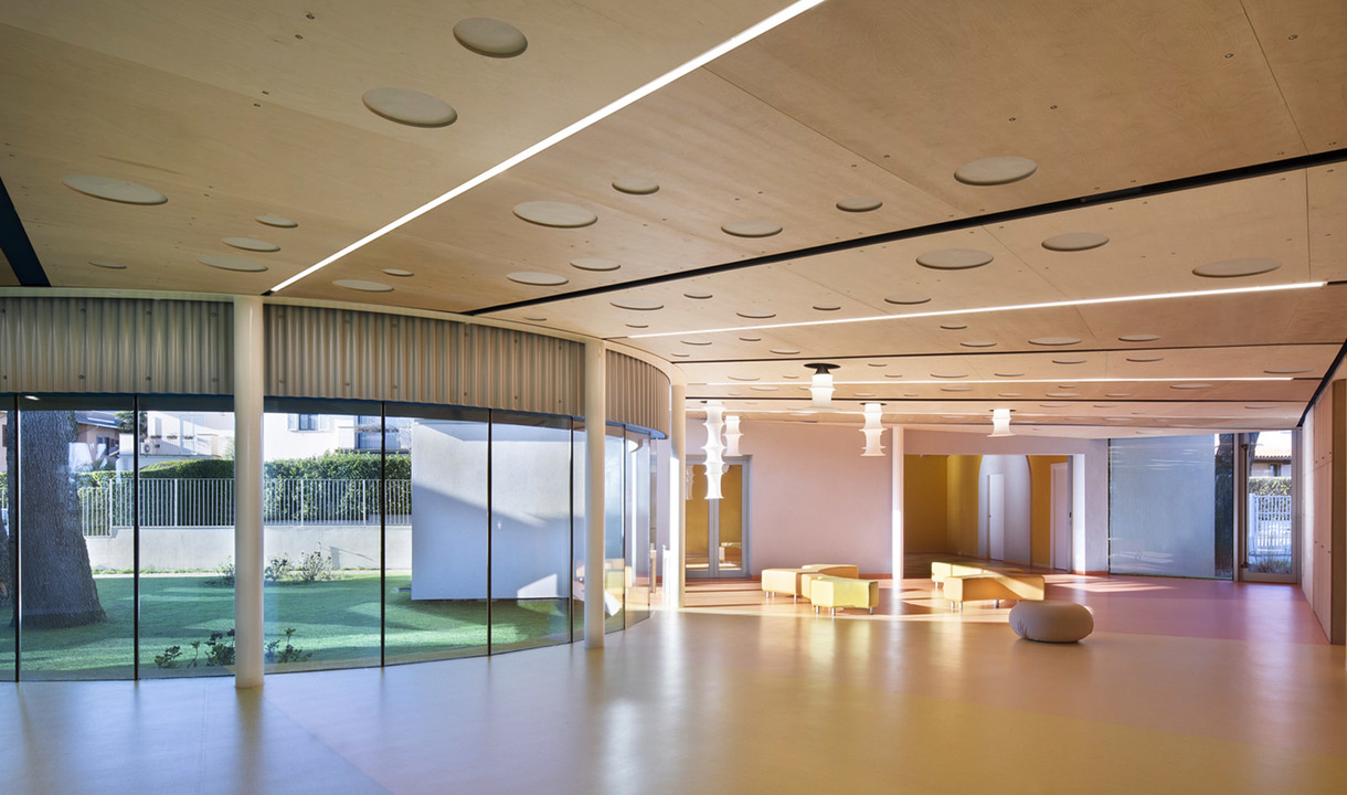 Il soffitto in legno è disegnato dai raggi di luce del sistema A.39.