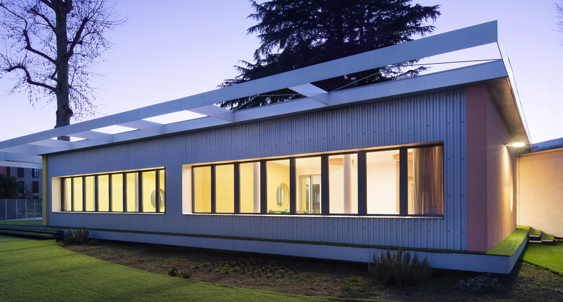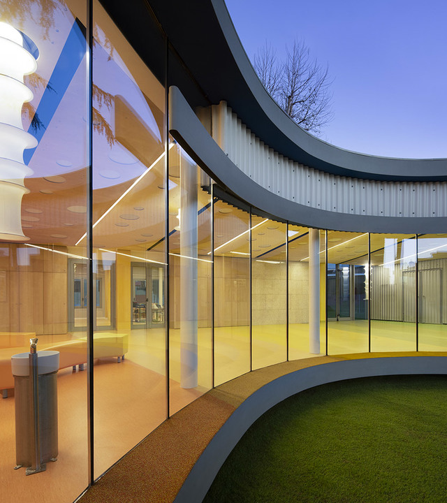 Il progetto architettonico consiste nella realizzazione di un nuovo volume di collegamento tra gli edifici esistenti: un grande portico ellittico vetrato sul parco.