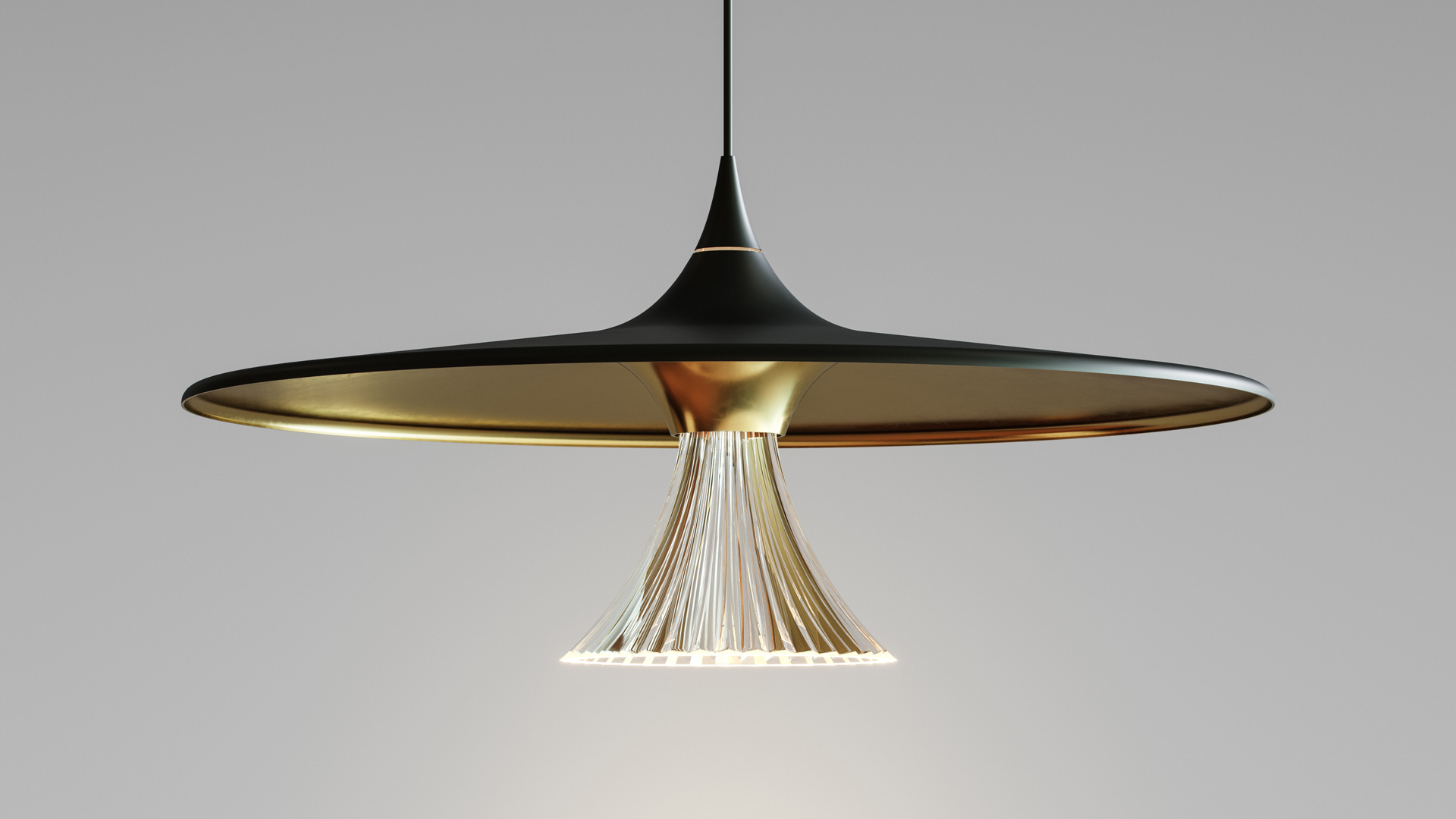 L’ottica si innesta in un disco metallico che si allunga morbidamente a cono verso il punto di sospensione, sottolineato da un sottile dettaglio di luce.