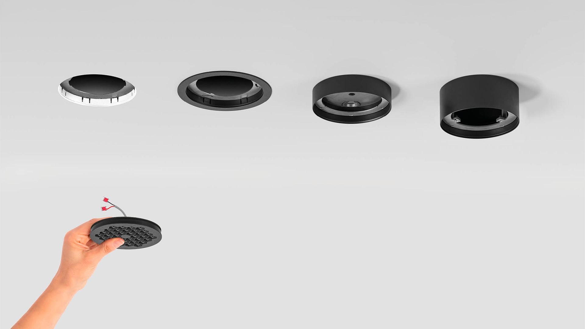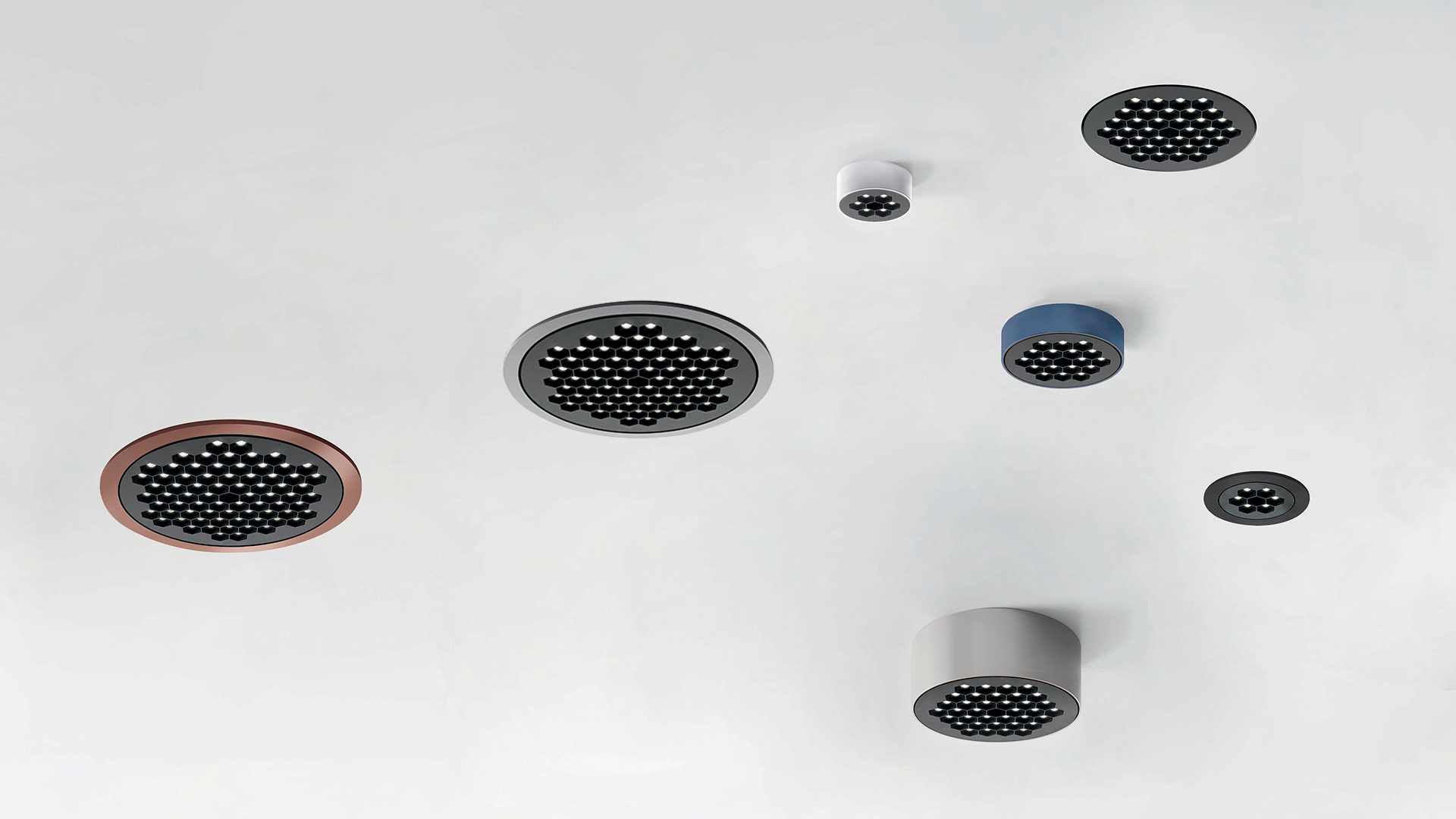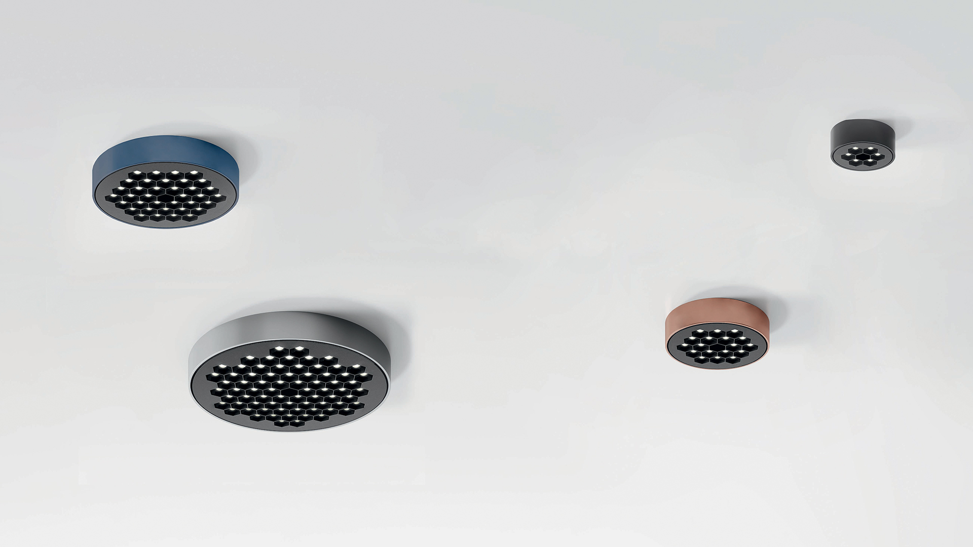 Il motore ottico ultra-sottile (12,5 mm) integra una lente circolare che cattura e controlla il 100% della luce emessa, garantendo massimo comfort visivo. La geometria ispirata alla natura permette configurazioni modulari, lineari o radiali.
