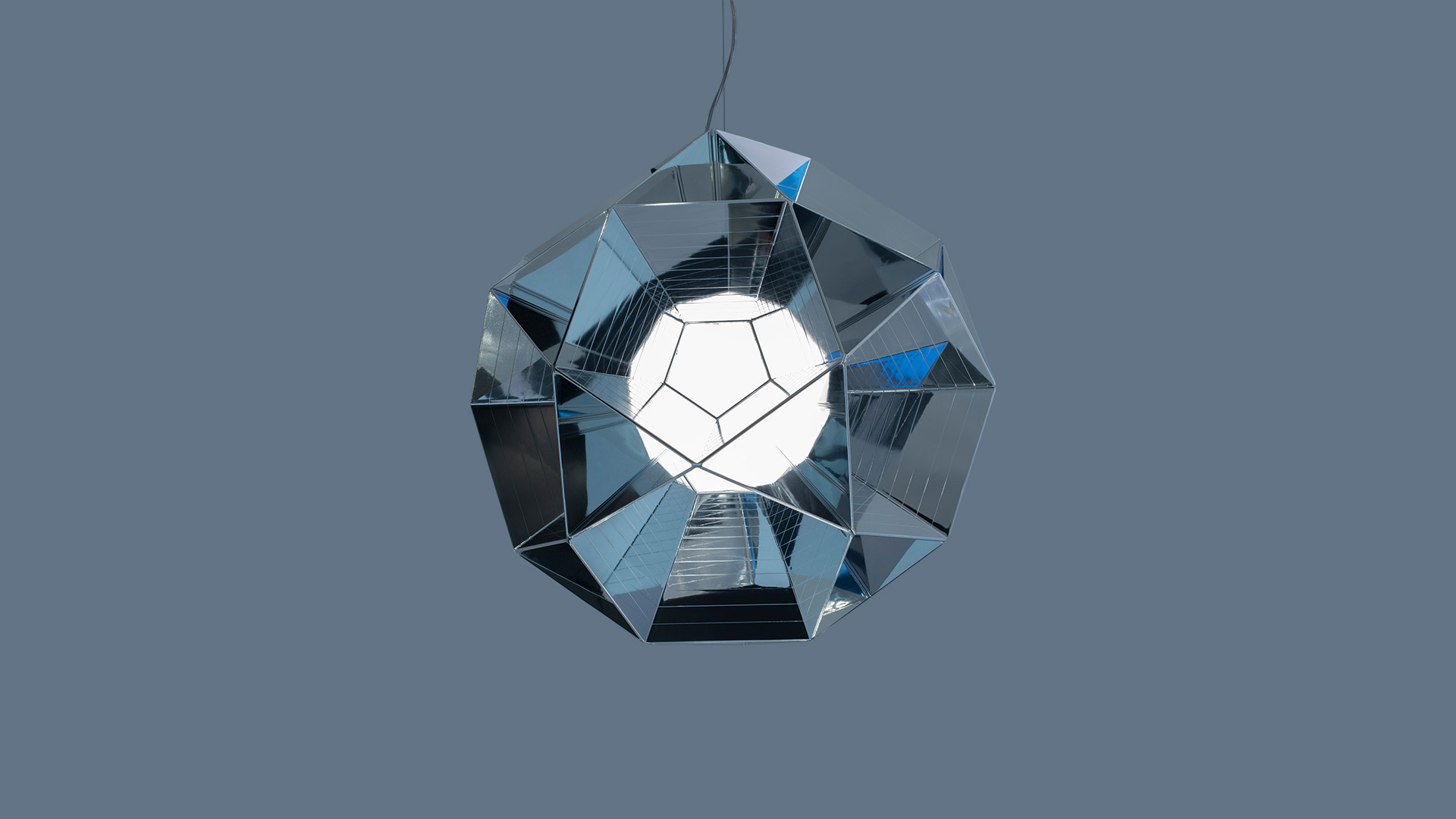 La forma finale richiama un solido archimedeo privo di superfici esterne: la struttura nasce dalla proiezione dei lati pentagonali che si irradiano dal centro, dove si trova una sfera diffusore.
