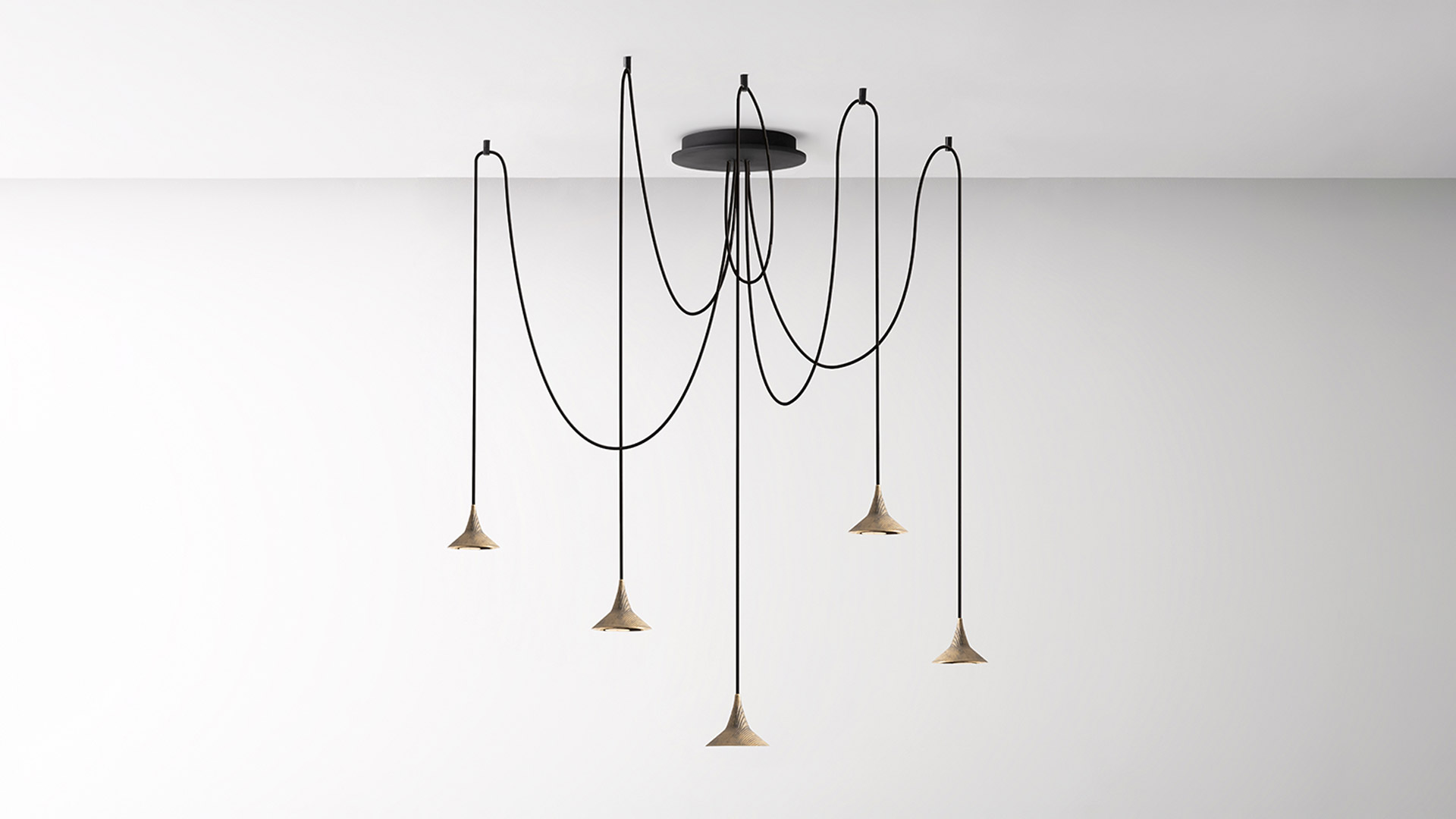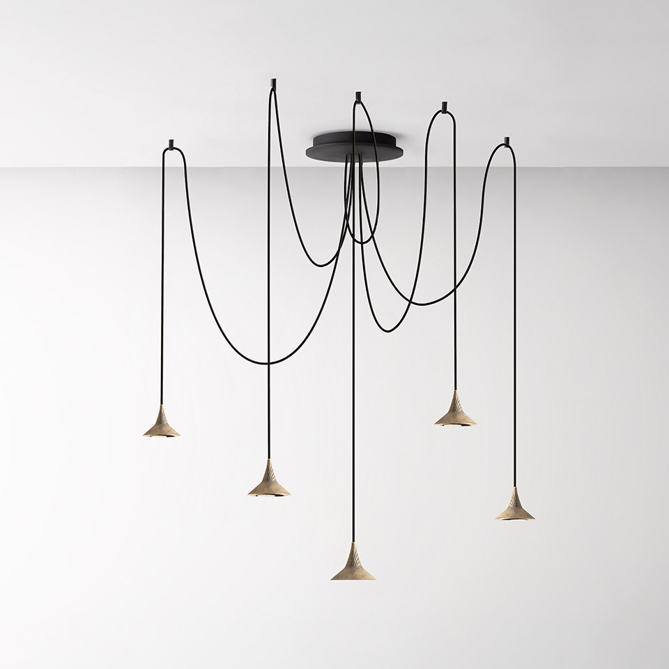 Unterlinden free chandelier è composto da cinque elementi di sospensione che conducono tutti a un unico punto centrale. I cavi, lunghi 2,5 metri, possono essere disposti liberamente per creare composizioni che seguono diverse disposizioni.