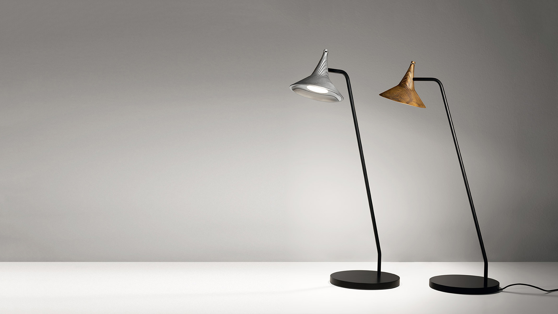 Da questo ampliamento sono nate anche una versione da parete e una da terra, caratterizzate da un contrappeso che permette di regolare l'altezza del corpo illuminante, il cui cavo scorre all'interno di un supporto.