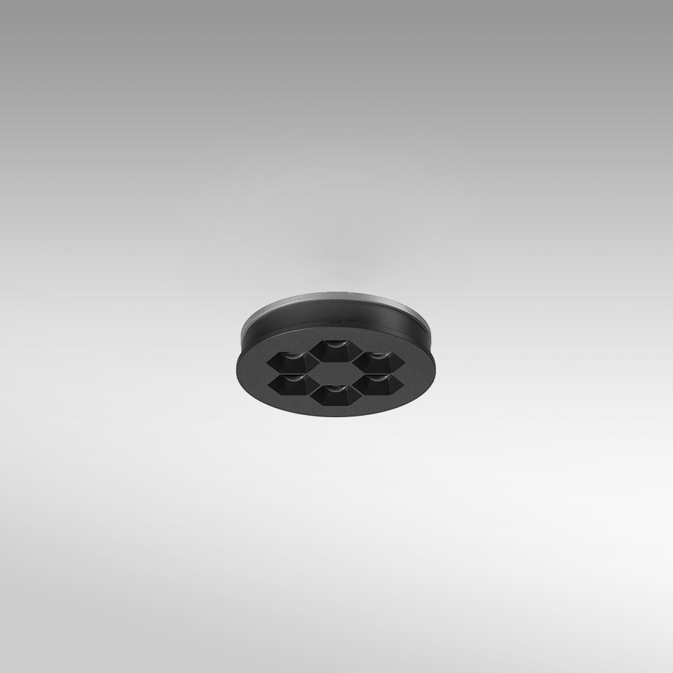 Il motore ottico ultra-sottile (12,5 mm) integra una lente circolare che cattura e controlla il 100% della luce emessa, garantendo massimo comfort visivo. La geometria ispirata alla natura permette configurazioni modulari, lineari o radiali.